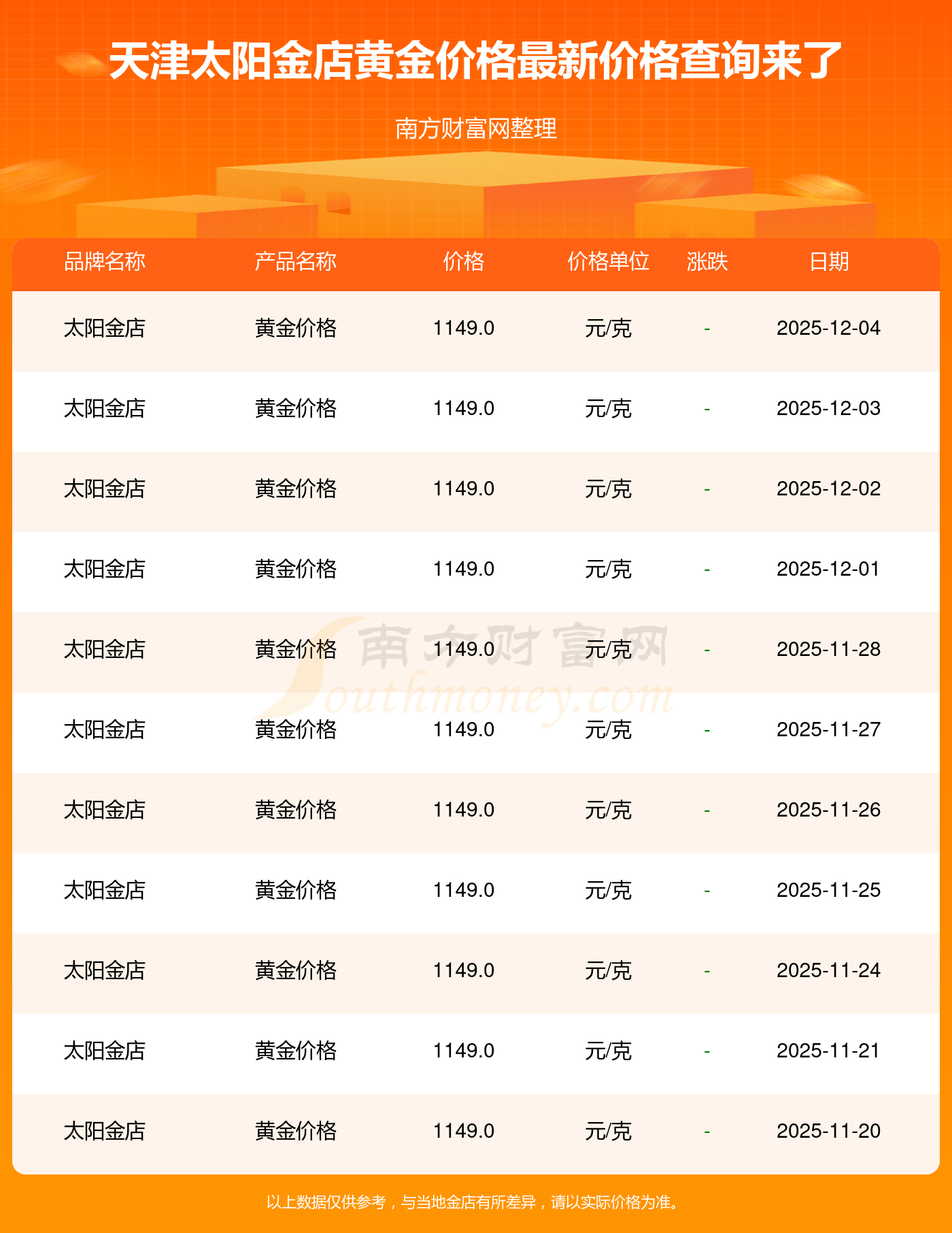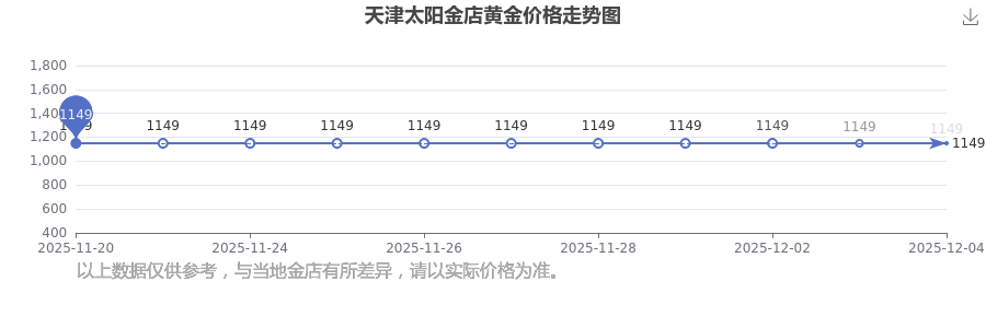 今日(2025年12月4日),天津太陽金店黃金價格的定價為 1149.0元/克。