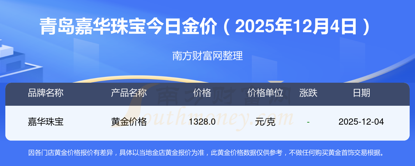 今日黃金價格查詢_現在金價黃金一克多少錢,黃金價格是多少錢一克?2025年12月4日青島嘉華珠寶今日價格:黃金價格1328.0元/克,鉑金價格671.0元/克,飾品金價(內地)1328.0元/克,黃金飾品(香港)46730.0,鉑金價格(香港)19260.0,金條價格(香港)42160.0,金條金價(內地)1165.0元/克,黃金價格1325.0元/克,鉑金價格600.0元/克,足金價格1325.0元/克,黃金價格1326.0元/克。