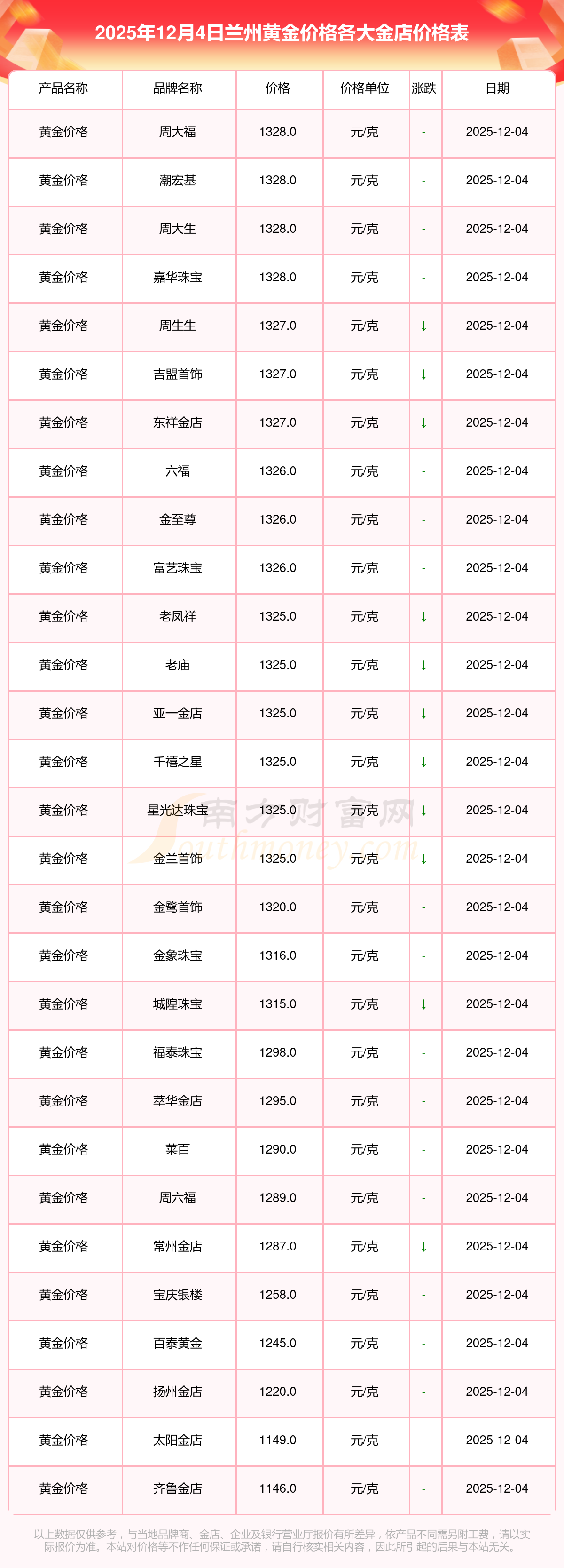 2025年12月4日蘭州各大金店黃金價(jià)格最新價(jià)格查詢來了:周大福1328.0元/克,周大福671.0元/克,周大福1328.0元/克,周大福46730.0,周大福19260.0,周大福42160.0,周大福1165.0元/克,老鳳祥1325.0元/克,老鳳祥600.0元/克,老鳳祥1325.0元/克,六福1326.0元/克。