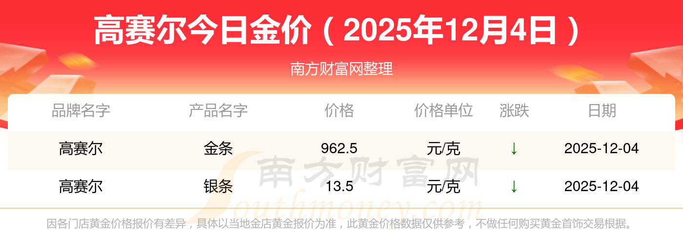 現(xiàn)在高賽爾黃金價(jià)格是多少錢1克_2025年高賽爾今日金價(jià)是多少錢一克,最新高賽爾查詢,2025年12月4日高賽爾金條現(xiàn)在每克多少錢?最新高賽爾金條報(bào)價(jià)公布,一起來看看吧!
