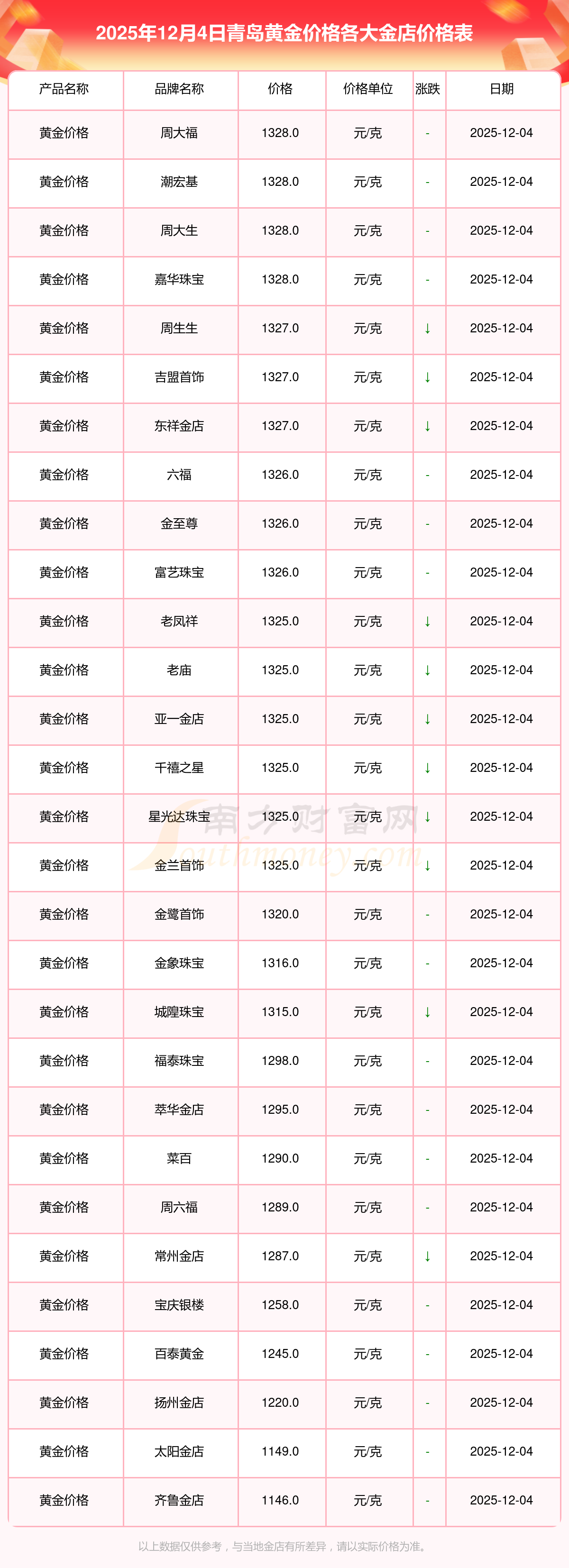 今天是2025年12月4日,青島周大福、周大福、周大福、周大福、周大福、周大福、周大福、老鳳祥、老鳳祥、老鳳祥、六福等各大金店品牌黃金價格最新價格行情是這樣的:周大福1328.0元/克、周大福671.0元/克、周大福1328.0元/克、周大福46730.0、周大福19260.0、周大福42160.0、周大福1165.0元/克、老鳳祥1325.0元/克、老鳳祥600.0元/克、老鳳祥1325.0元/克、六福1326.0元/克。