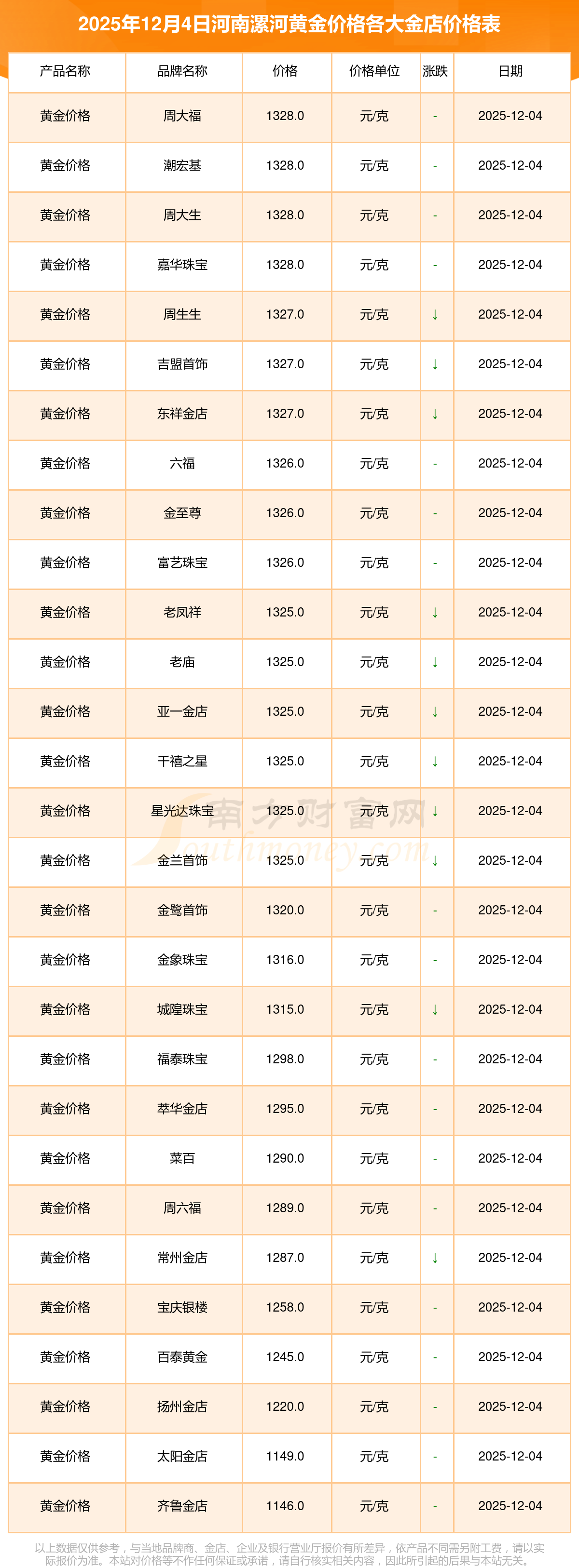 2025年12月4日河南漯河周大福、周大福、周大福、周大福、周大福、周大福、周大福、老鳳祥、老鳳祥、老鳳祥、六福等各大金店品牌黃金價格最新價格如下:周大福黃金價格1328.0元/克,周大福鉑金價格671.0元/克,周大福飾品金價(內(nèi)地)1328.0元/克,周大福黃金飾品(香港)46730.0,周大福鉑金價格(香港)19260.0,周大福金條價格(香港)42160.0,周大福金條金價(內(nèi)地)1165.0元/克,老鳳祥黃金價格1325.0元/克,老鳳祥鉑金價格600.0元/克,老鳳祥足金價格1325.0元/克,六福黃金價格1326.0元/克。