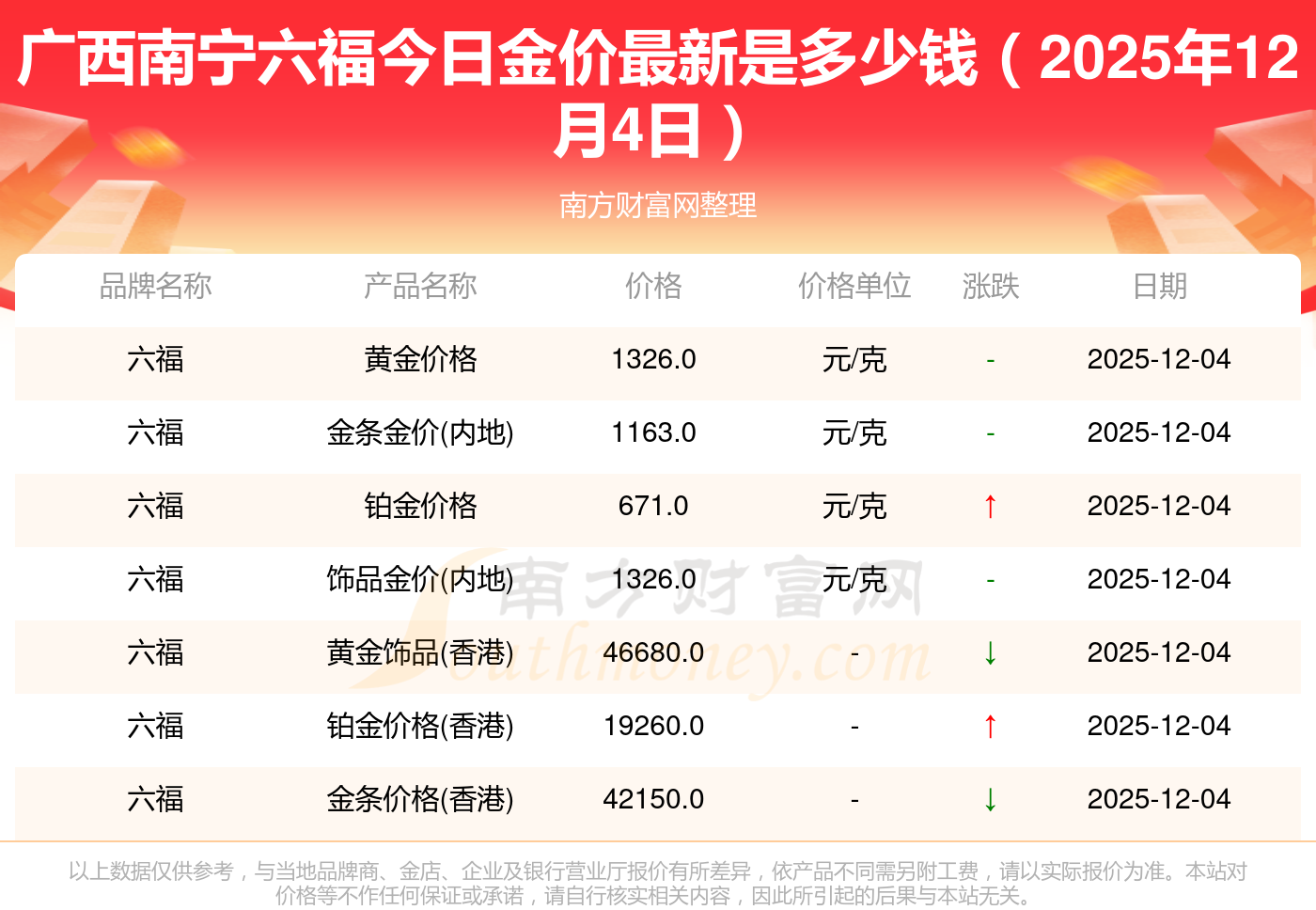2025年12月4日廣西南寧六福黃金一克的市場行情價是多少?黃金價格1328.0元/克,鉑金價格671.0元/克,飾品金價(內(nèi)地)1328.0元/克,黃金飾品(香港)46730.0,鉑金價格(香港)19260.0,金條價格(香港)42160.0,金條金價(內(nèi)地)1165.0元/克,黃金價格1325.0元/克,鉑金價格600.0元/克,足金價格1325.0元/克,黃金價格1326.0元/克。