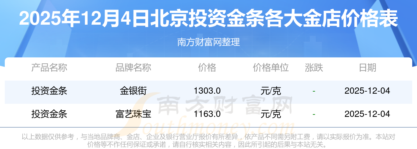 2025年12月4日北京各大金店投資金條最新價格查詢來了:周大福1328.0元/克,周大福671.0元/克,周大福1328.0元/克,周大福46730.0,周大福19260.0,周大福42160.0,周大福1165.0元/克,老鳳祥1325.0元/克,老鳳祥600.0元/克,老鳳祥1325.0元/克,六福1326.0元/克。