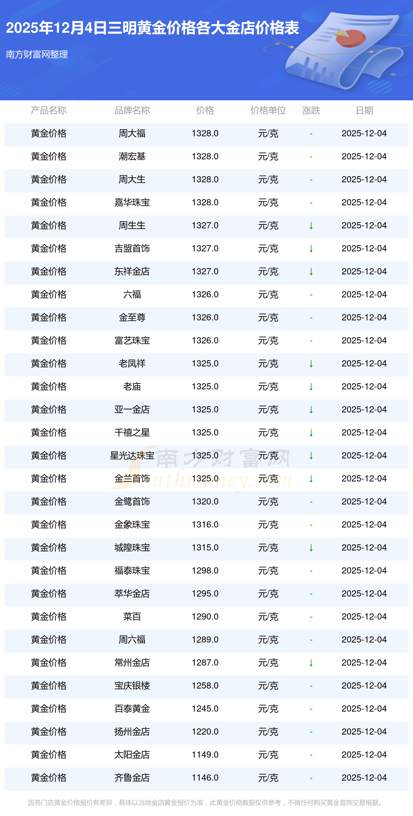 2025年12月4日三明周大福、周大福、周大福、周大福、周大福、周大福、周大福、老鳳祥、老鳳祥、老鳳祥、六福等各大金店品牌黃金價(jià)格最新價(jià)格如下:周大福黃金價(jià)格1328.0元/克,周大福鉑金價(jià)格671.0元/克,周大福飾品金價(jià)(內(nèi)地)1328.0元/克,周大福黃金飾品(香港)46730.0,周大福鉑金價(jià)格(香港)19260.0,周大福金條價(jià)格(香港)42160.0,周大福金條金價(jià)(內(nèi)地)1165.0元/克,老鳳祥黃金價(jià)格1325.0元/克,老鳳祥鉑金價(jià)格600.0元/克,老鳳祥足金價(jià)格1325.0元/克,六福黃金價(jià)格1326.0元/克。