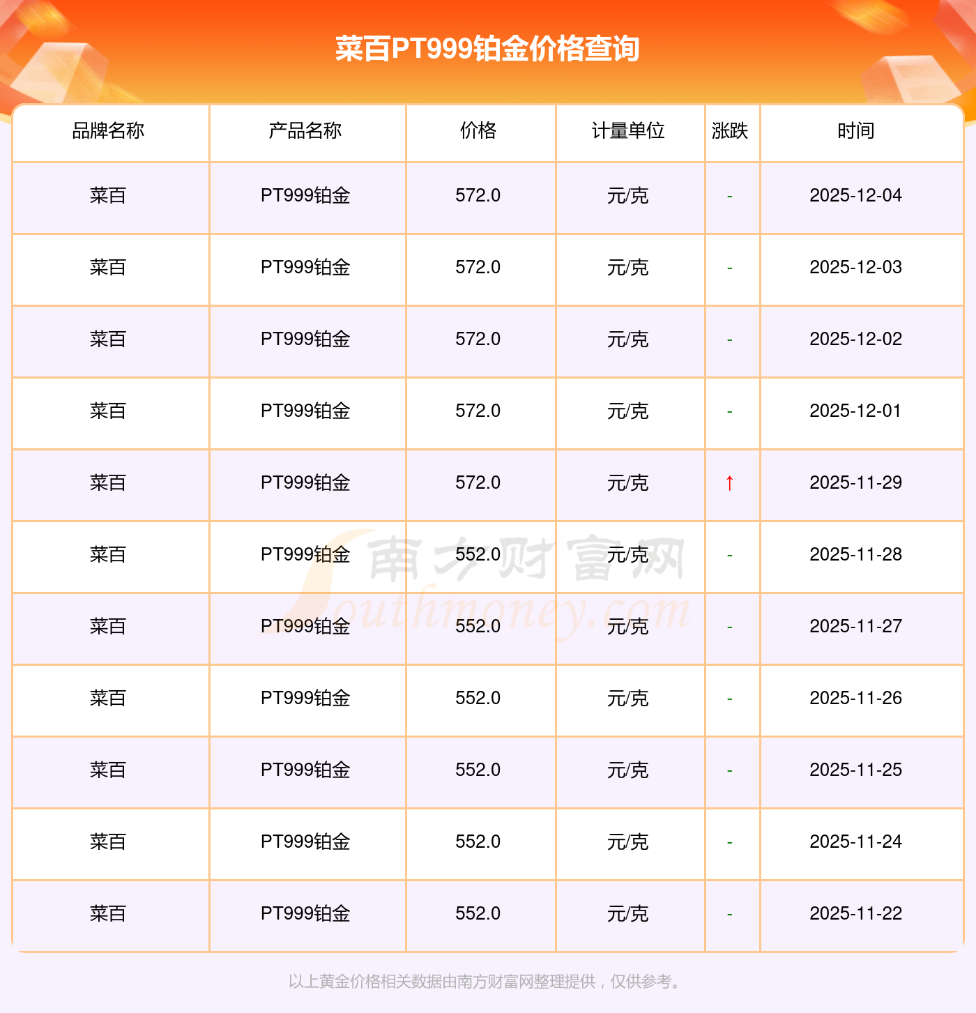 今日菜百 PT999鉑金價(jià)格,最新確定為572.0元/克。