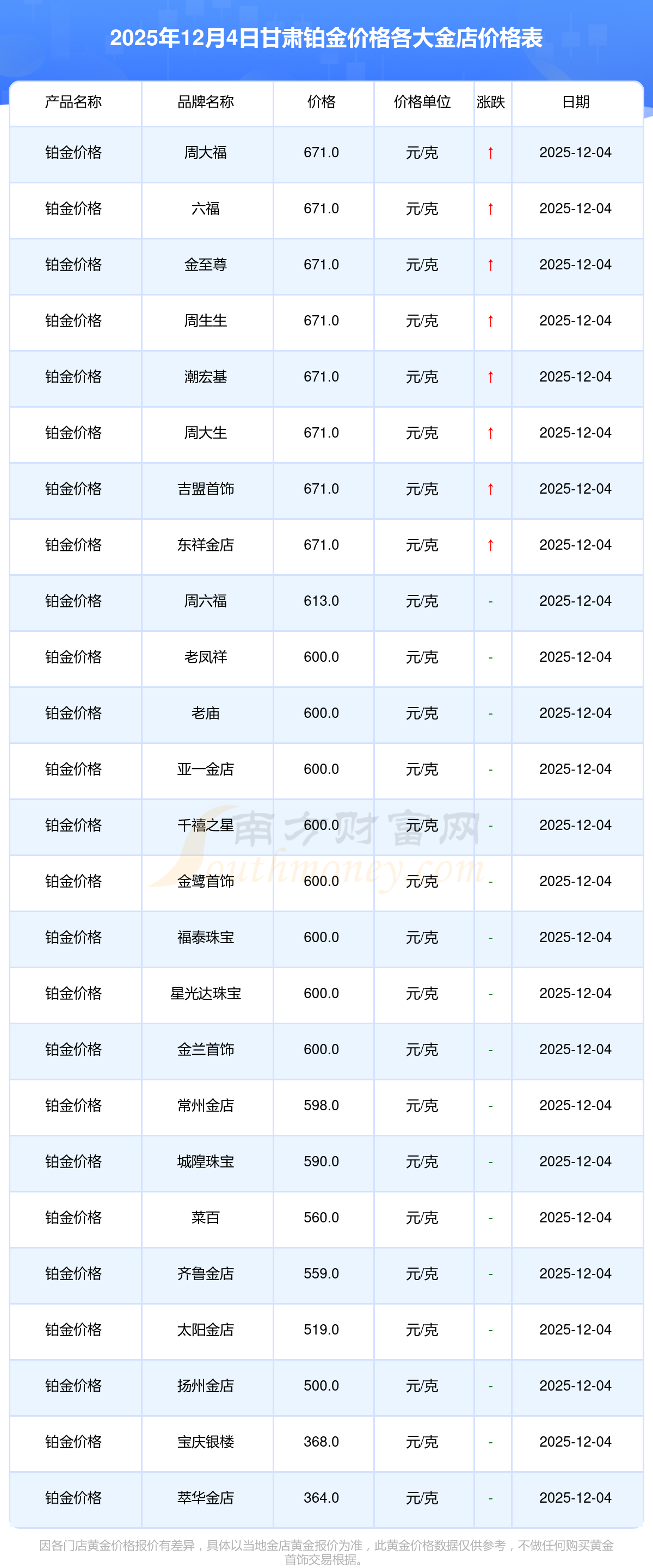 2025年12月4日甘肅周大福、周大福、周大福、周大福、周大福、周大福、周大福、老鳳祥、老鳳祥、老鳳祥、六福等各大金店品牌鉑金價格最新價格行情來了,如下:周大福黃金價格1328.0元/克,周大福鉑金價格671.0元/克,周大福飾品金價(內地)1328.0元/克,周大福黃金飾品(香港)46730.0,周大福鉑金價格(香港)19260.0,周大福金條價格(香港)42160.0,周大福金條金價(內地)1165.0元/克,老鳳祥黃金價格1325.0元/克,老鳳祥鉑金價格600.0元/克,老鳳祥足金價格1325.0元/克,六福黃金價格1326.0元/克。
