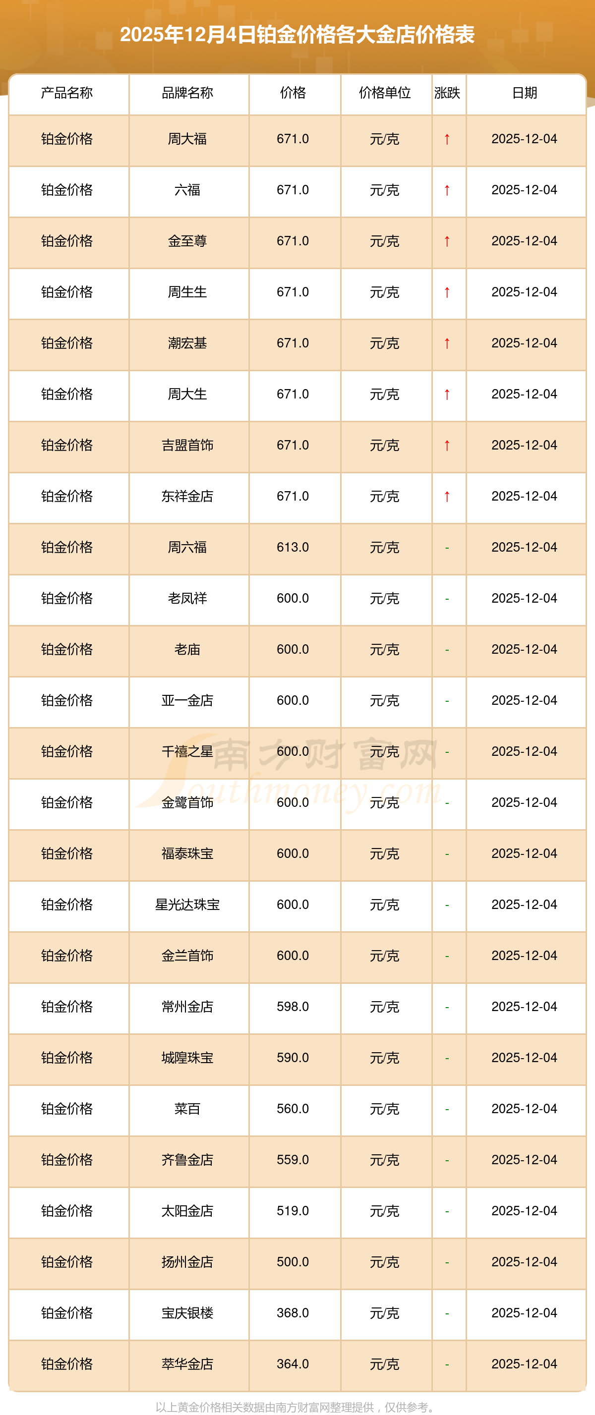 今天是2025年12月4日,周大福、周大福、周大福、周大福、周大福、周大福、周大福、老鳳祥、老鳳祥、老鳳祥、六福等各大金店品牌鉑金價(jià)格最新價(jià)格如下:周大福1328.0元/克、周大福671.0元/克、周大福1328.0元/克、周大福46730.0、周大福19260.0、周大福42160.0、周大福1165.0元/克、老鳳祥1325.0元/克、老鳳祥600.0元/克、老鳳祥1325.0元/克、六福1326.0元/克。