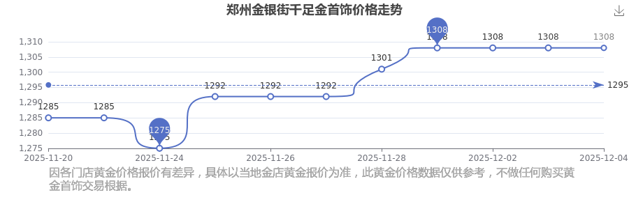 2025年12月4日,鄭州金銀街所售千足金首飾,其價(jià)格設(shè)定為 1308.0元/克。