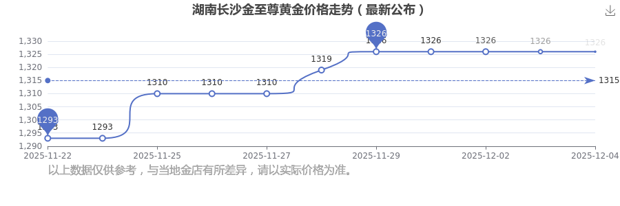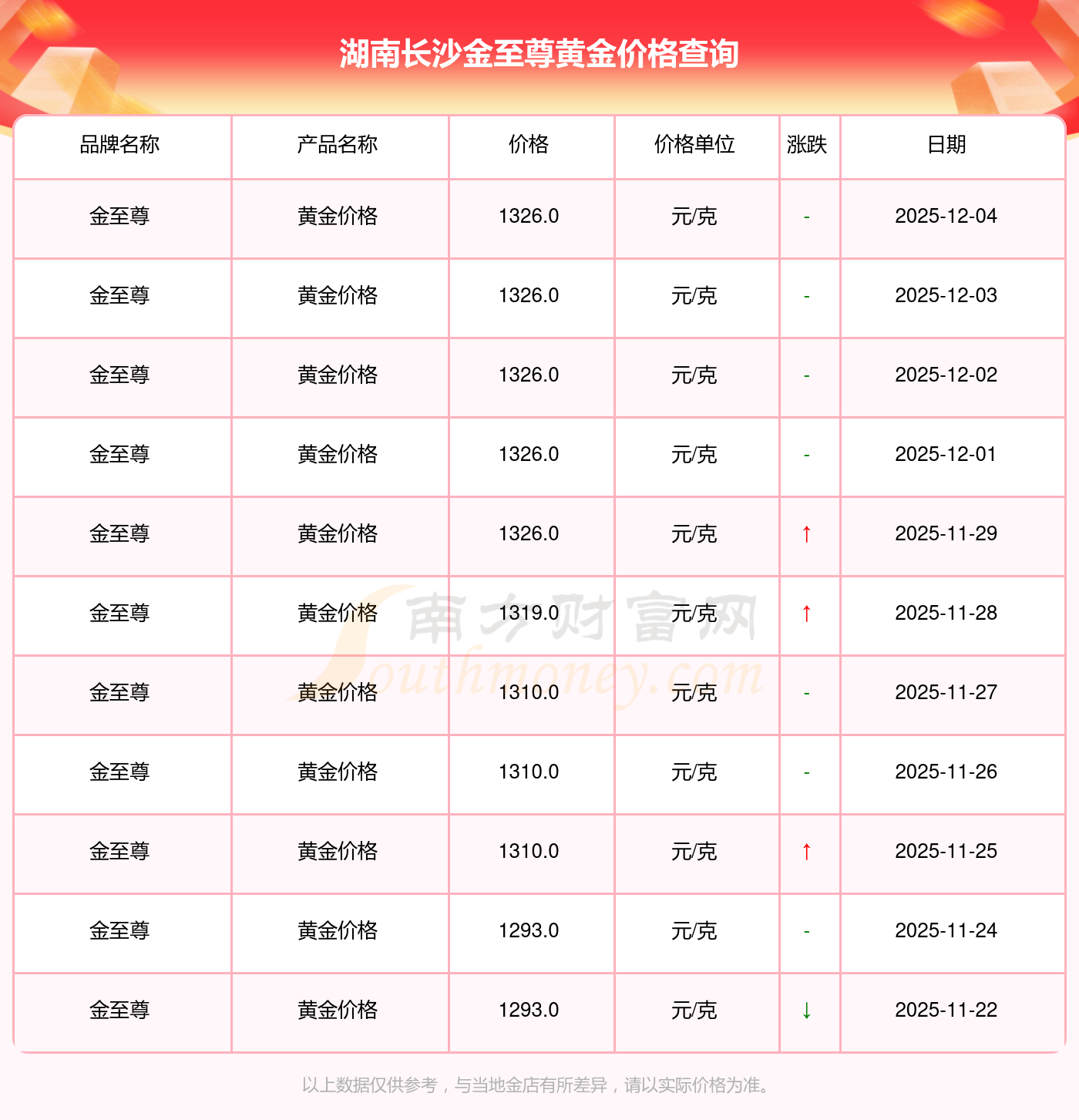 于 2025年12月4日,湖南長沙金至尊黃金價格的克價為1326.0元/克。