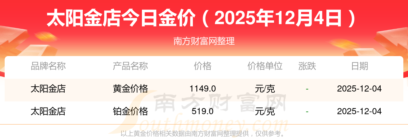 2025年12月4日太陽金店今日價(jià)格:黃金價(jià)格1328.0元/克,鉑金價(jià)格671.0元/克,飾品金價(jià)(內(nèi)地)1328.0元/克,黃金飾品(香港)46730.0,鉑金價(jià)格(香港)19260.0,金條價(jià)格(香港)42160.0,金條金價(jià)(內(nèi)地)1165.0元/克,黃金價(jià)格1325.0元/克,鉑金價(jià)格600.0元/克,足金價(jià)格1325.0元/克,黃金價(jià)格1326.0元/克。