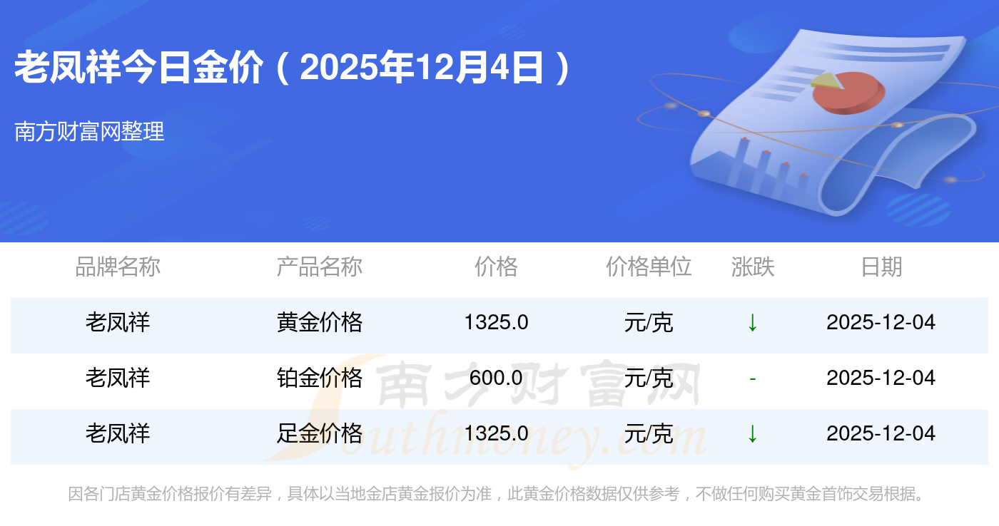 2025年12月4日老鳳祥金價查詢:黃金價格1328.0元/克,鉑金價格671.0元/克,飾品金價(內(nèi)地)1328.0元/克,黃金飾品(香港)46730.0,鉑金價格(香港)19260.0,金條價格(香港)42160.0,金條金價(內(nèi)地)1165.0元/克,黃金價格1325.0元/克,鉑金價格600.0元/克,足金價格1325.0元/克,黃金價格1326.0元/克。