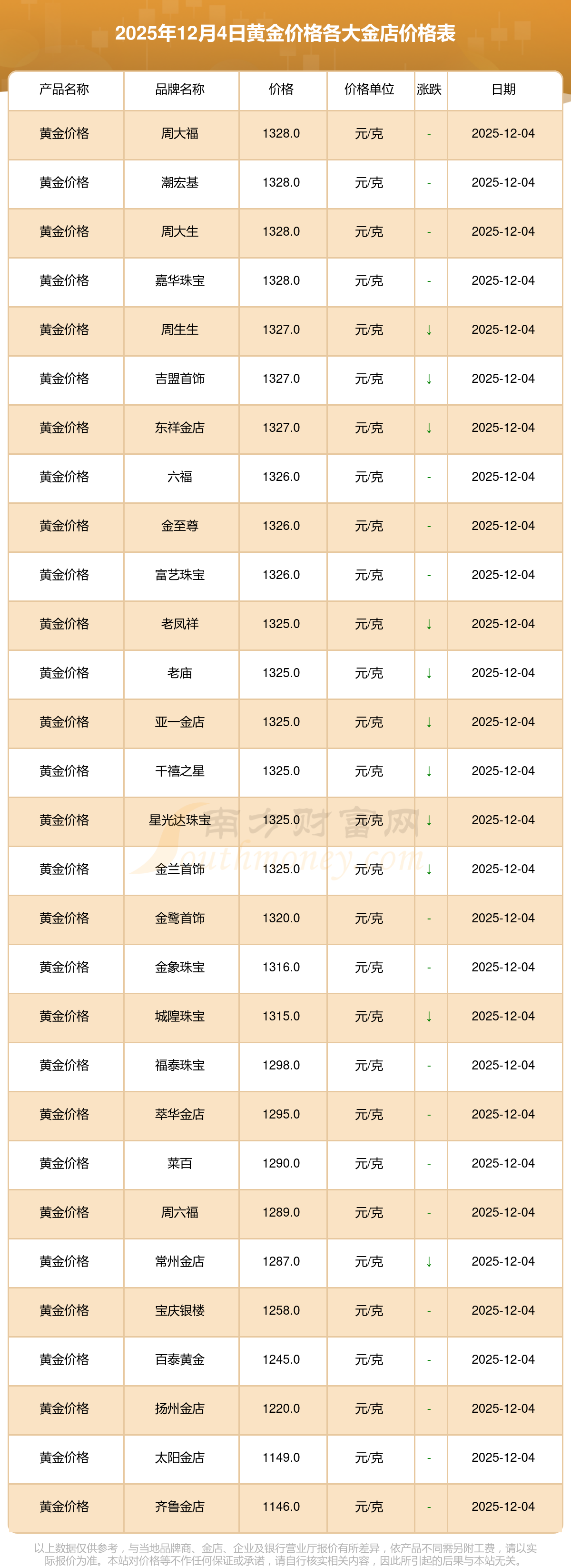 2025年12月4日各大金店黃金價格最新價格:周大福1328.0元/克,周大福671.0元/克,周大福1328.0元/克,周大福46730.0,周大福19260.0,周大福42160.0,周大福1165.0元/克,老鳳祥1325.0元/克,老鳳祥600.0元/克,老鳳祥1325.0元/克,六福1326.0元/克。