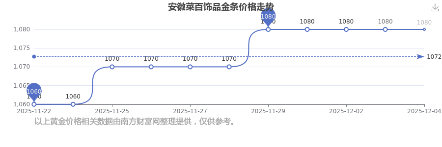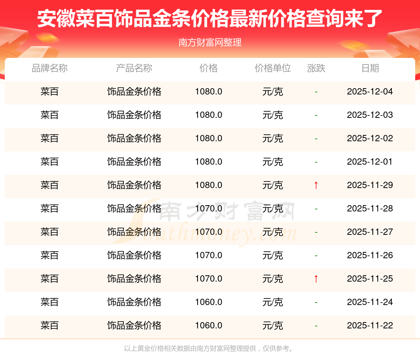 安徽菜百在 2025年12月4日的飾品金條價格零售價格為 1080.0元/克。