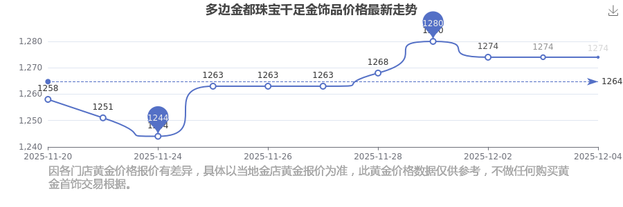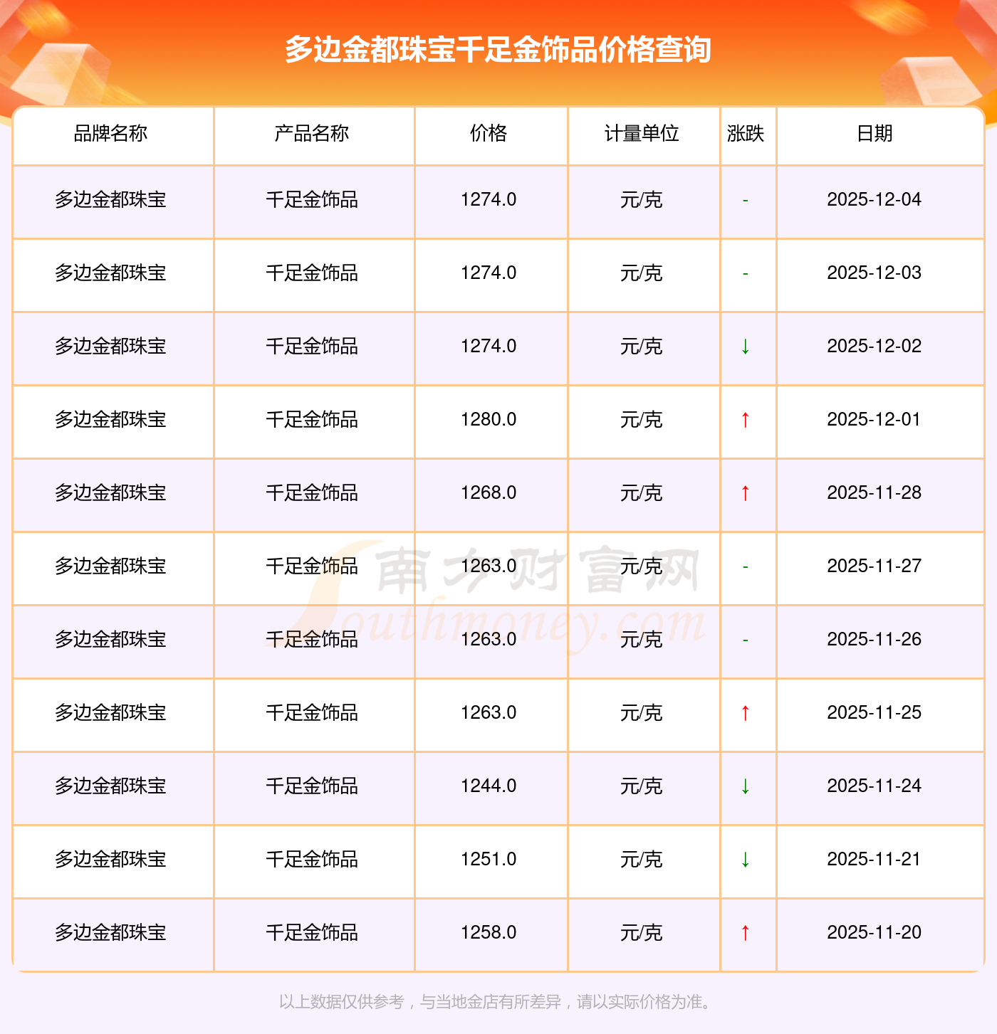 多邊金都珠寶 千足金飾品今日最新的價(jià)位是1274.0元/克。