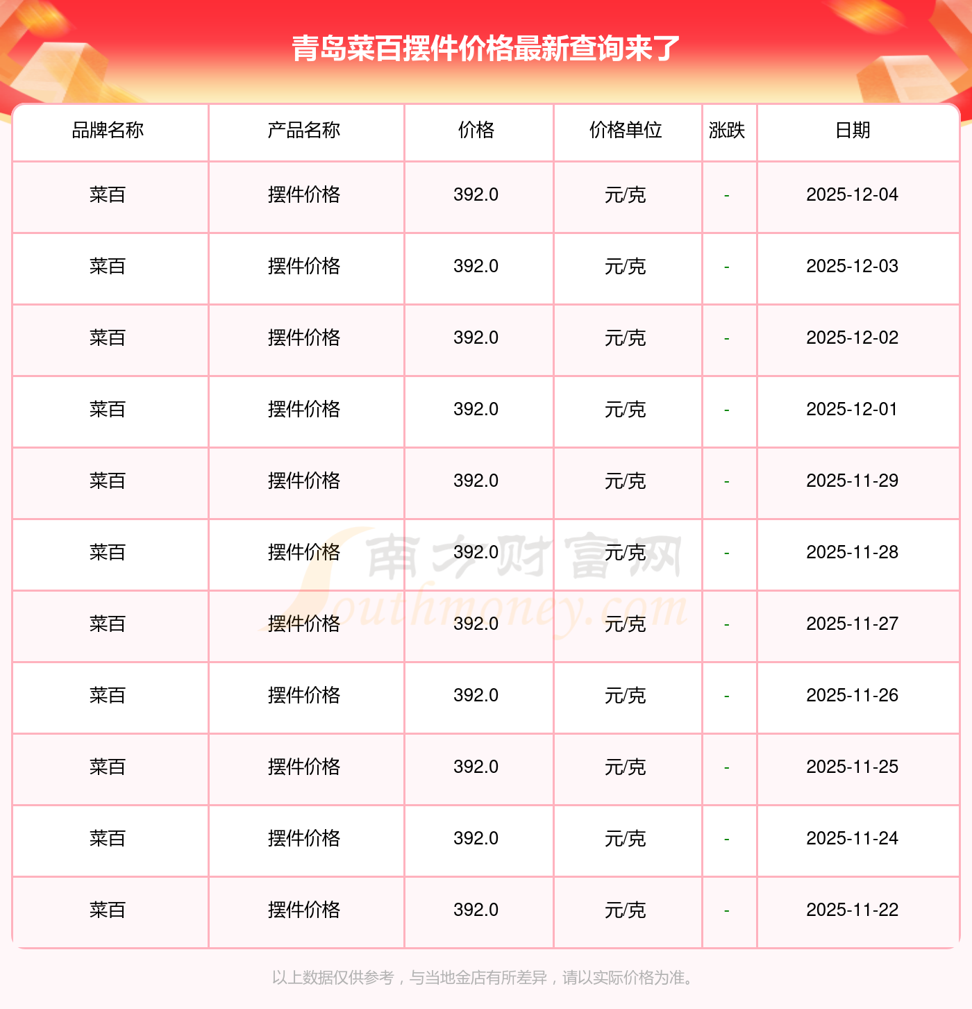 今日2025年12月4日,青島菜百擺件價(jià)格為392.0元/克。