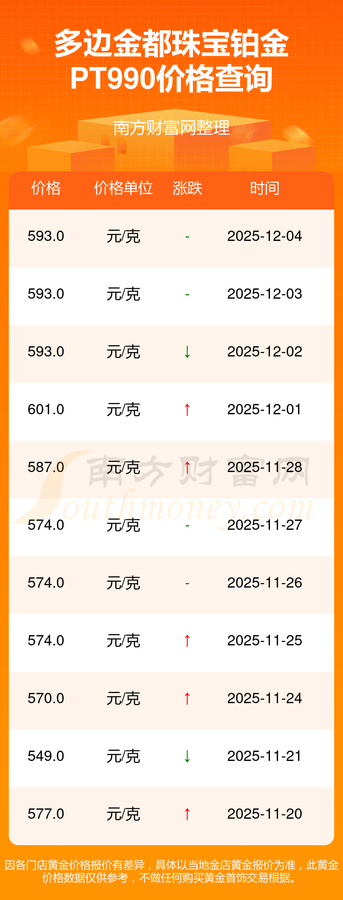 593.0元/克成為多邊金都珠寶今日 鉑金PT990的最新交易的價(jià)格。