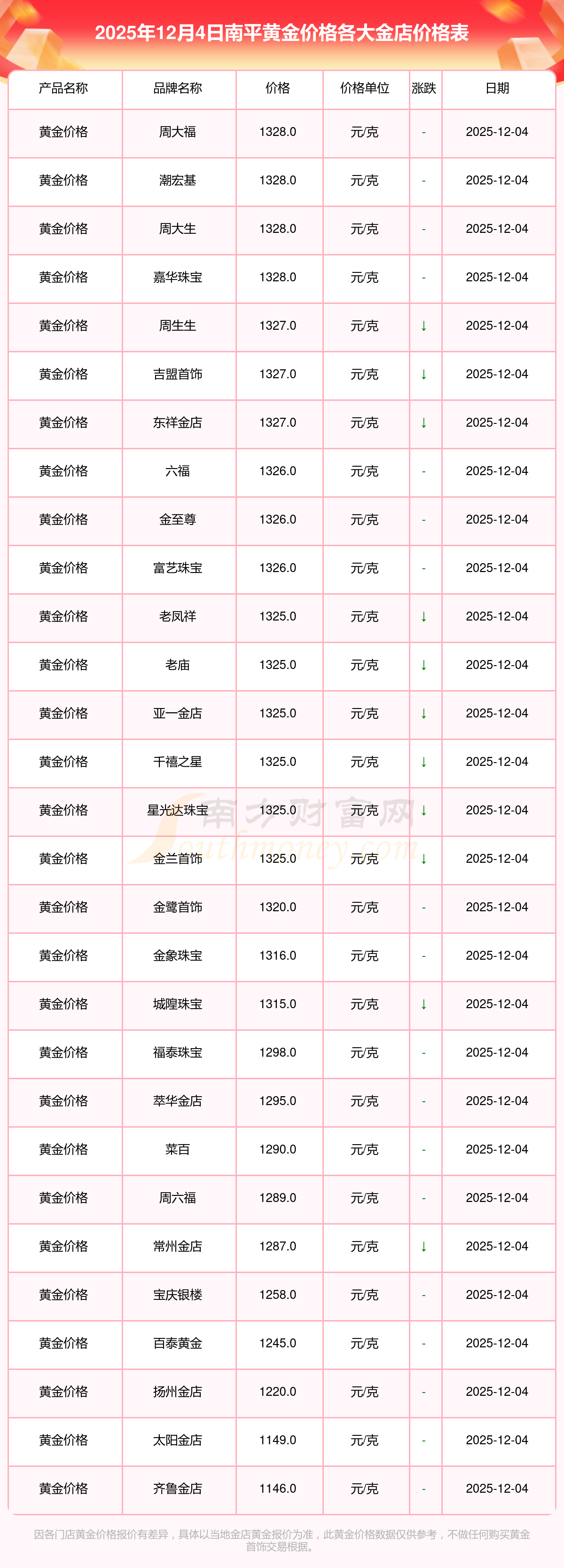 2025年12月4日,南平周大福、周大福、周大福、周大福、周大福、周大福、周大福、老鳳祥、老鳳祥、老鳳祥、六福等各大金店品牌黃金價(jià)格今日價(jià)格行情最新來(lái)了:周大福1328.0元/克、周大福671.0元/克、周大福1328.0元/克、周大福46730.0、周大福19260.0、周大福42160.0、周大福1165.0元/克、老鳳祥1325.0元/克、老鳳祥600.0元/克、老鳳祥1325.0元/克、六福1326.0元/克。