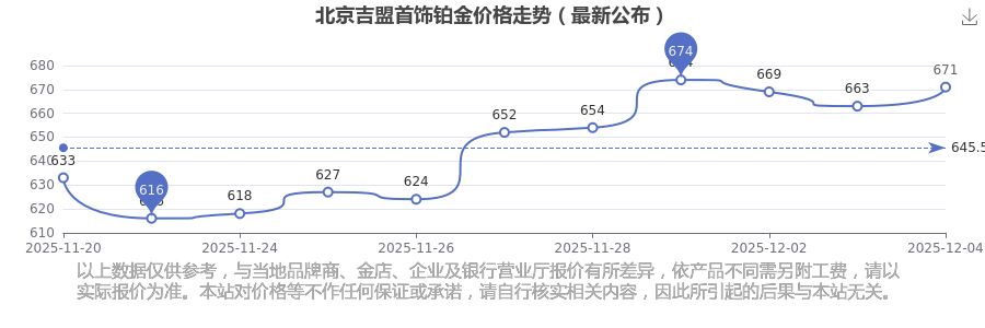今日(2025年12月4日),北京吉盟首飾鉑金價(jià)格每克的價(jià)值為671.0元/克。
