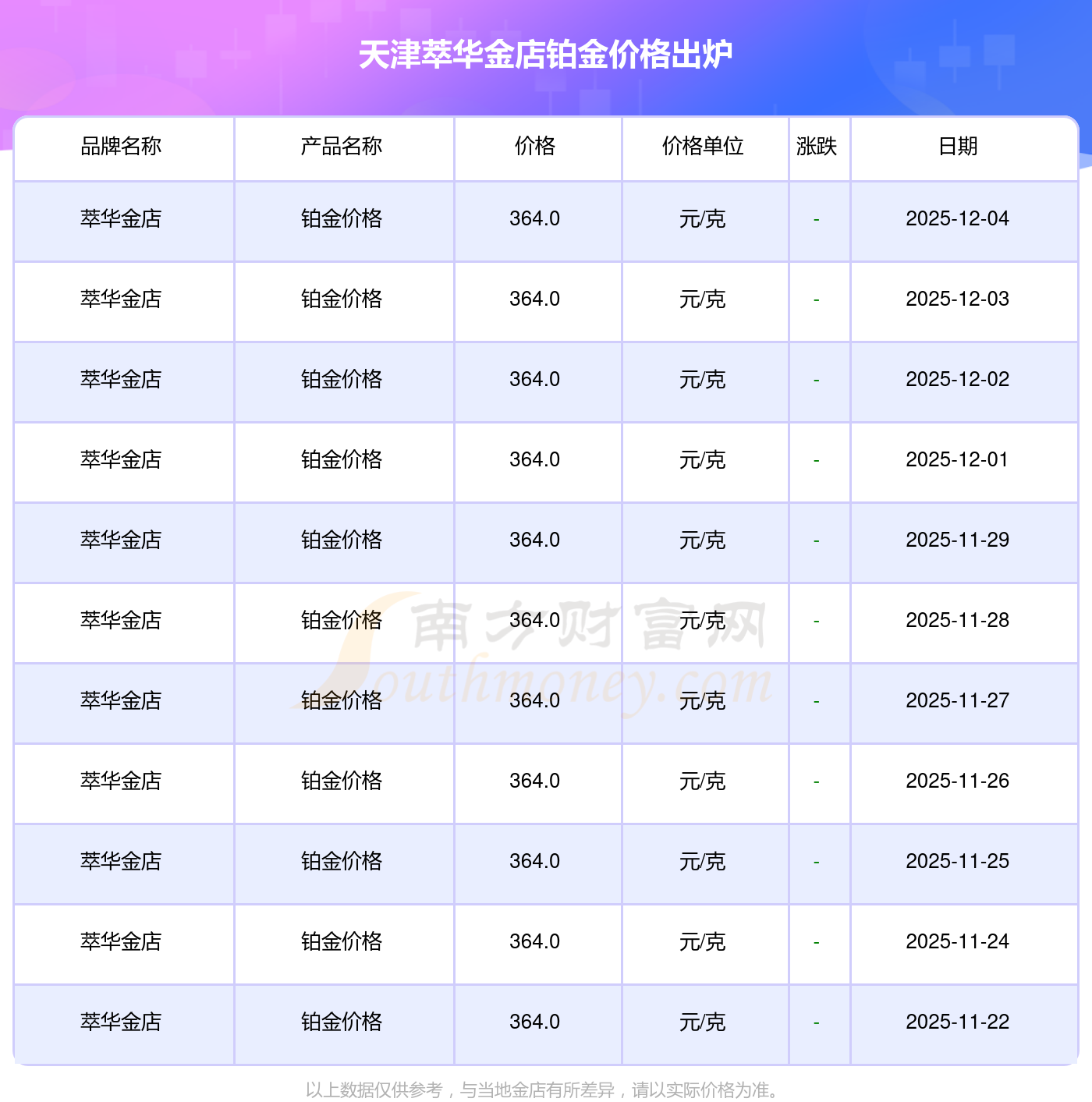 2025年12月4日,今日天津萃華金店鉑金價格:364.0元/克。