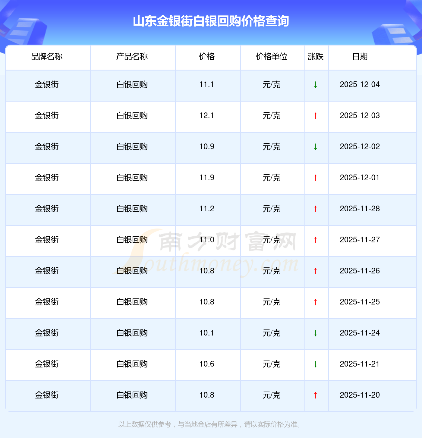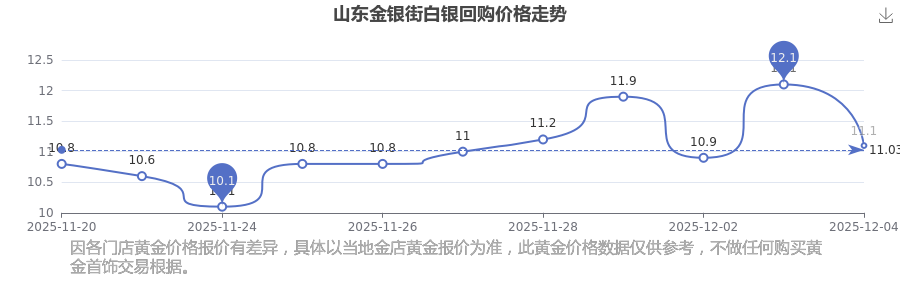 2025年12月4日山東金銀街白銀回購(gòu)價(jià)格為11.1元/克。