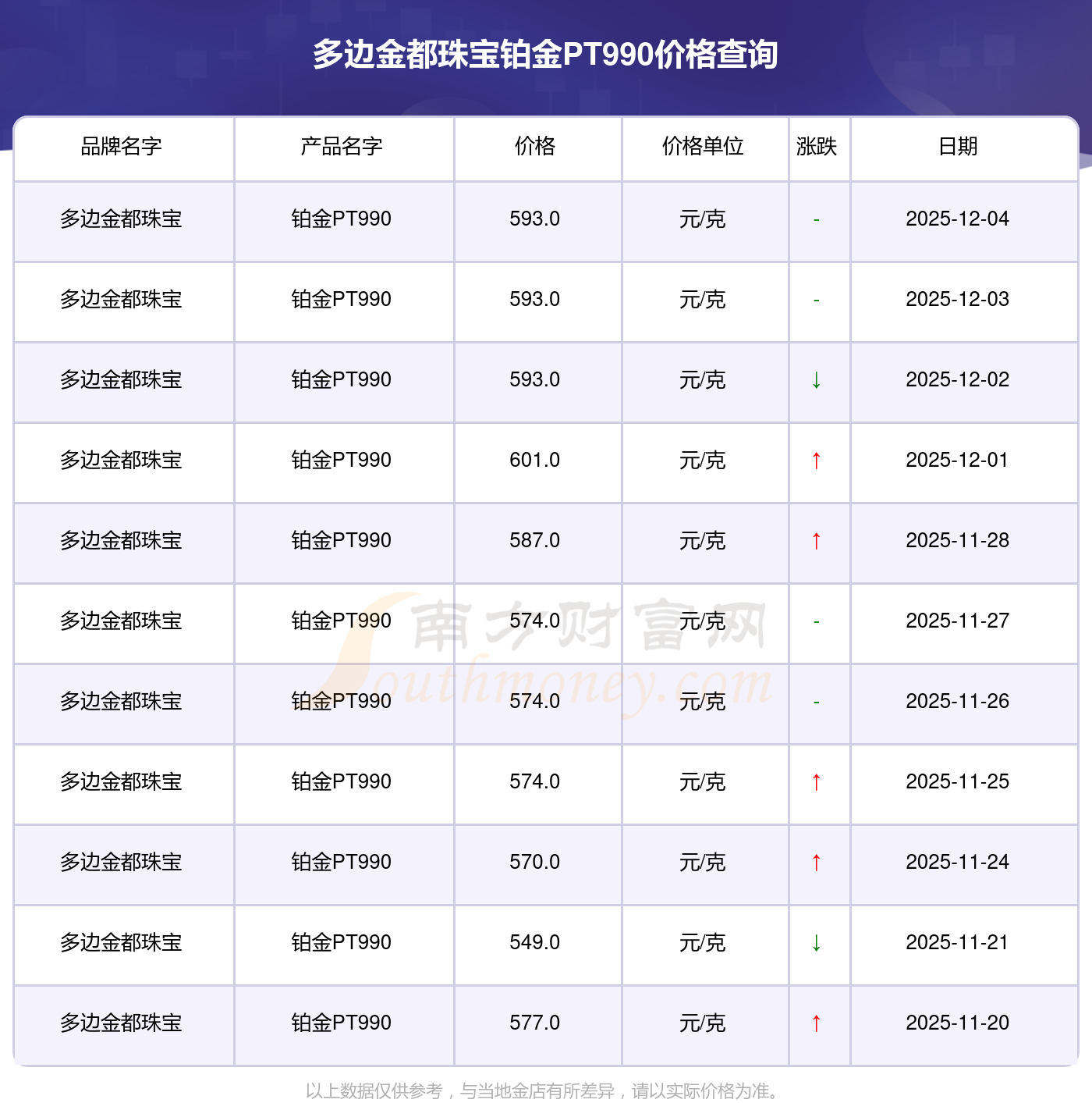 今日多邊金都珠寶鉑金PT990價(jià)格最新查詢:593.0元/克。