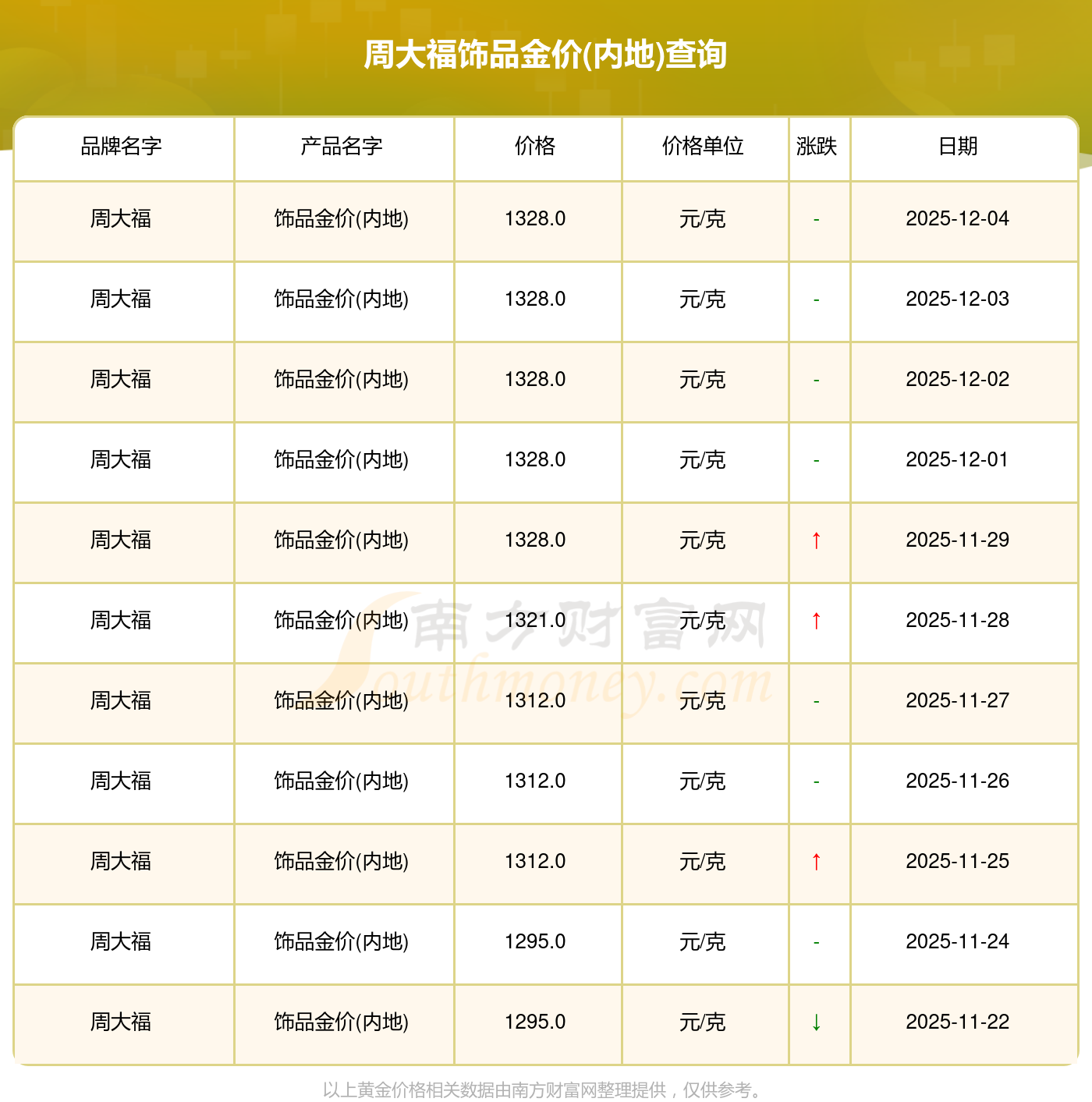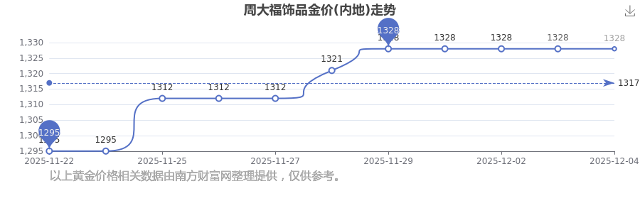今日(2025年12月4日)周大福飾品金價(jià)(內(nèi)地)的價(jià)格為1328.0元/克。
