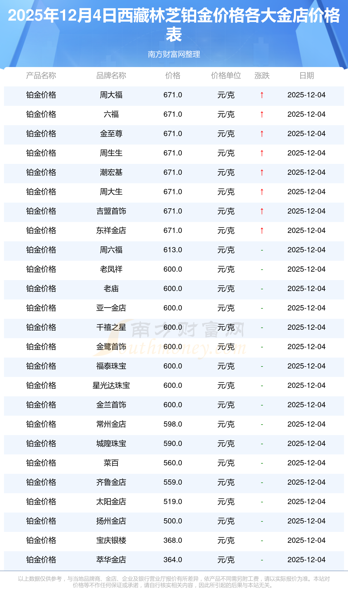 2025年12月4日西藏林芝各金店鉑金價(jià)格是多少錢(qián)一克?各金店鉑金價(jià)格表公布