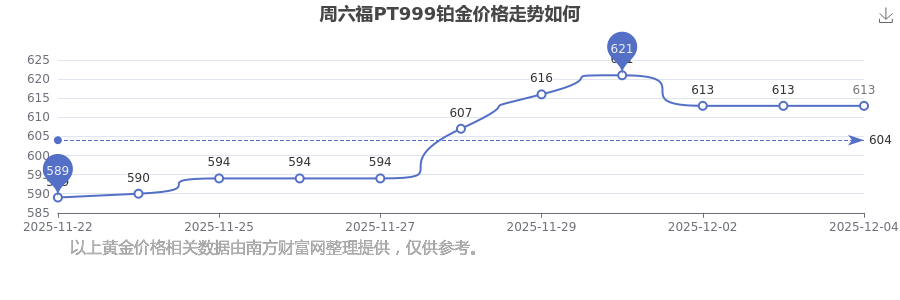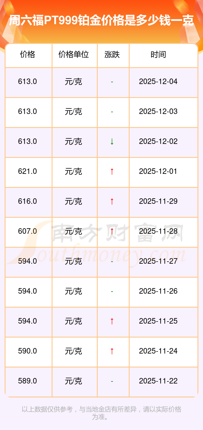 613.0元/克是周六福在今日給出的 PT999鉑金價(jià)格最新價(jià)格。