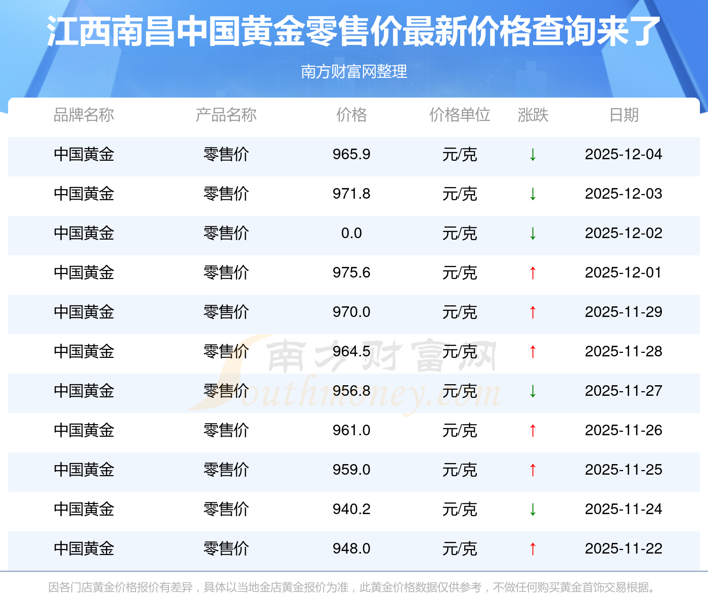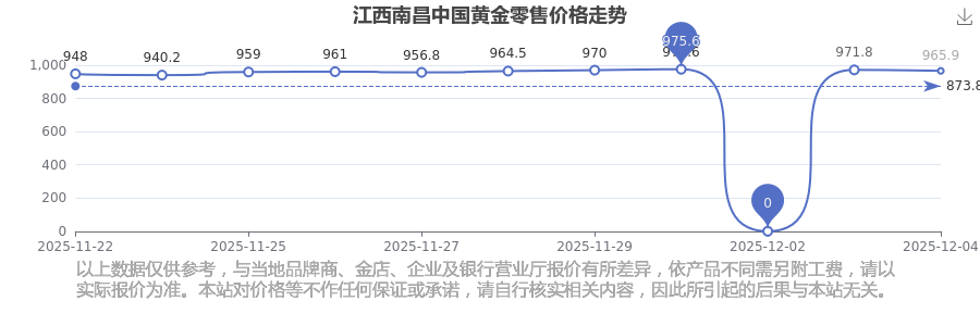 (2025年12月4日)江西南昌中國黃金零售價格現(xiàn)在為965.9元/克。