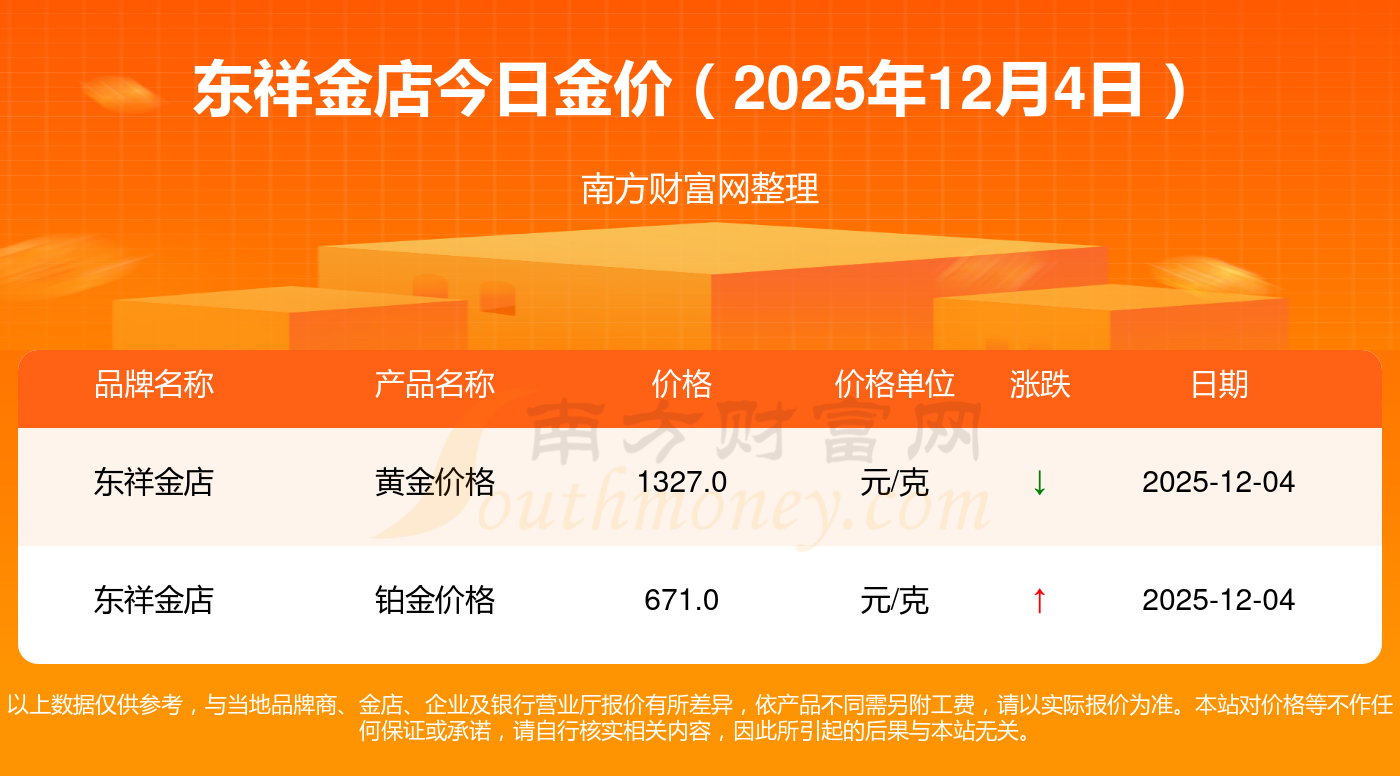 2025年12月4日各大金店黃金價(jià)格最新價(jià)格:周大福1328.0元/克,周大福671.0元/克,周大福1328.0元/克,周大福46730.0,周大福19260.0,周大福42160.0,周大福1165.0元/克,老鳳祥1325.0元/克,老鳳祥600.0元/克,老鳳祥1325.0元/克,六福1326.0元/克。