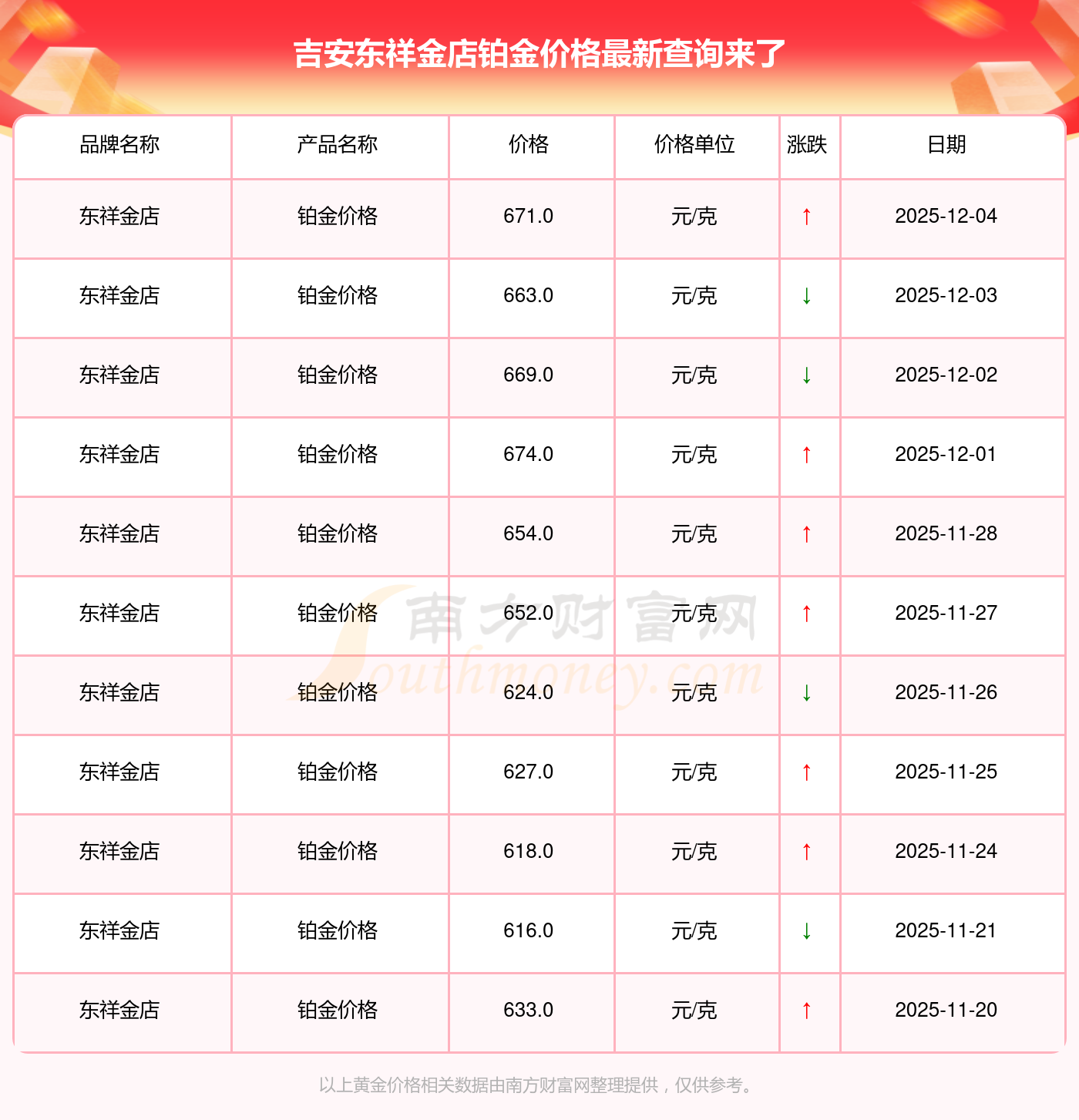 今日(2025年12月4日)吉安東祥金店鉑金價格為671.0元/克。