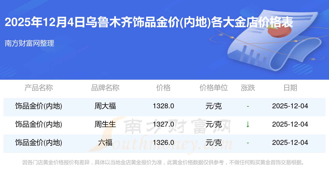 2025年12月4日,烏魯木齊周大福、周大福、周大福、周大福、周大福、周大福、周大福、老鳳祥、老鳳祥、老鳳祥、六福等各大金店品牌飾品金價(內(nèi)地)今日價格行情最新來了:周大福1328.0元/克、周大福671.0元/克、周大福1328.0元/克、周大福46730.0、周大福19260.0、周大福42160.0、周大福1165.0元/克、老鳳祥1325.0元/克、老鳳祥600.0元/克、老鳳祥1325.0元/克、六福1326.0元/克。