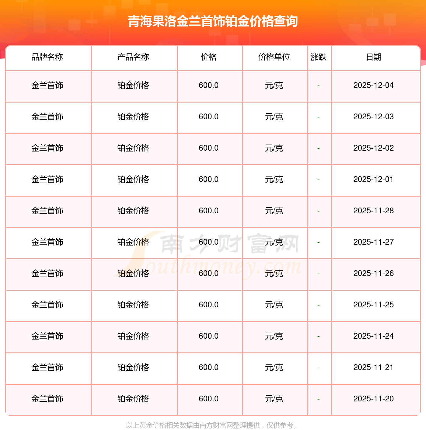 今日青海果洛金蘭首飾鉑金價(jià)格是600.0元/克。