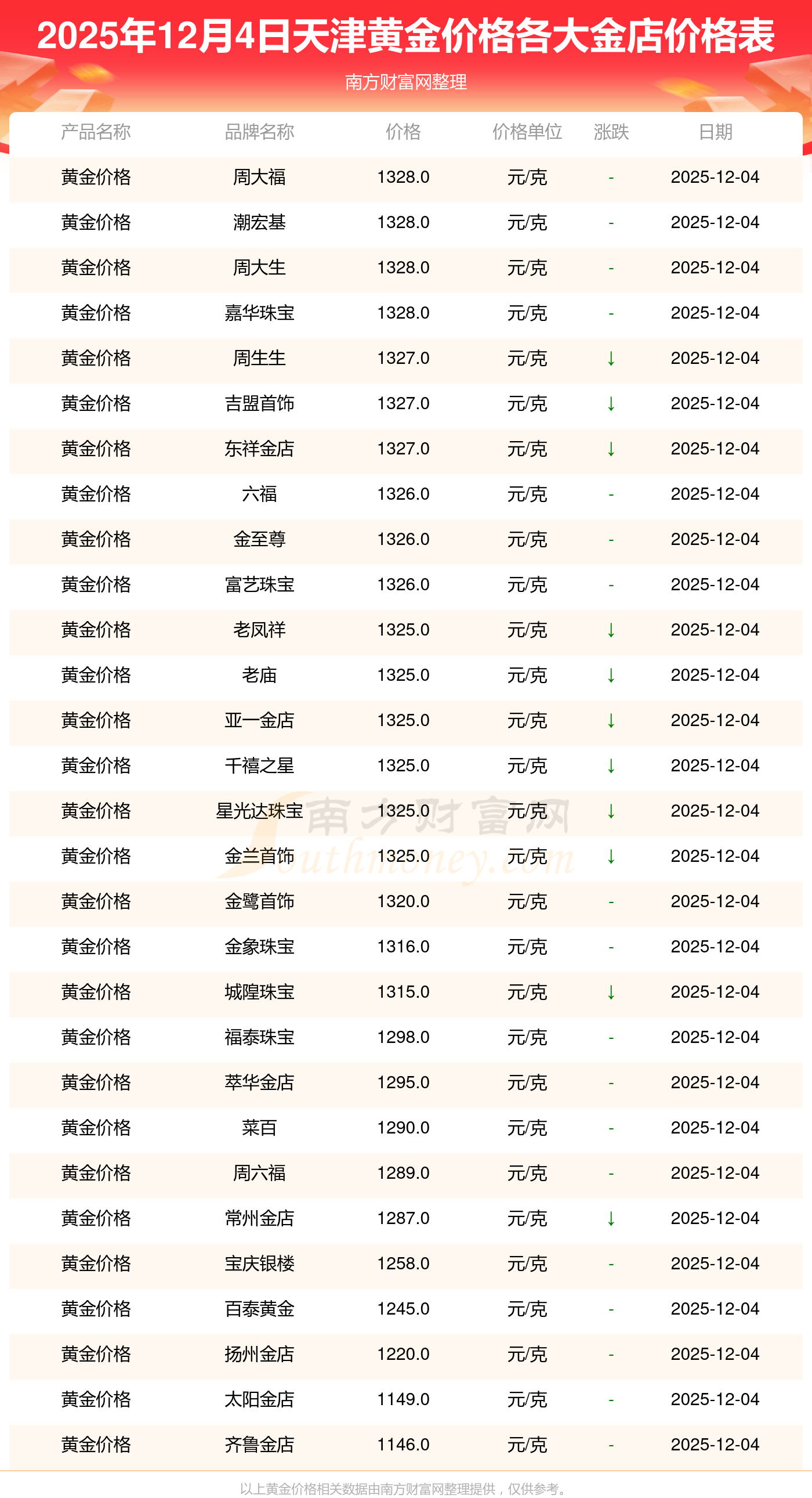 2025年12月4日,天津周大福、周大福、周大福、周大福、周大福、周大福、周大福、老鳳祥、老鳳祥、老鳳祥、六福等各大金店品牌黃金價(jià)格今日價(jià)格如下:周大福1328.0元/克、周大福671.0元/克、周大福1328.0元/克、周大福46730.0、周大福19260.0、周大福42160.0、周大福1165.0元/克、老鳳祥1325.0元/克、老鳳祥600.0元/克、老鳳祥1325.0元/克、六福1326.0元/克。
