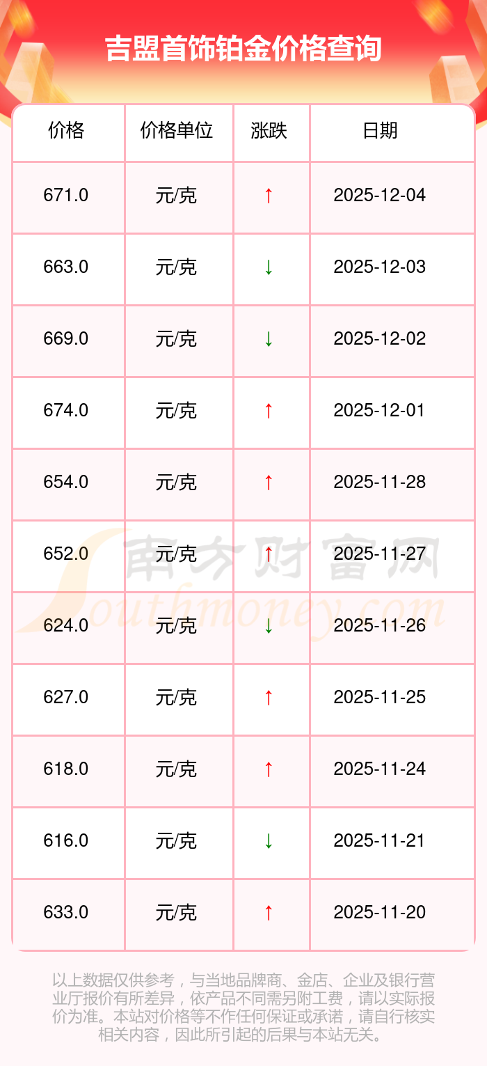 今日吉盟首飾 鉑金價格最新的市場標價為671.0元/克。