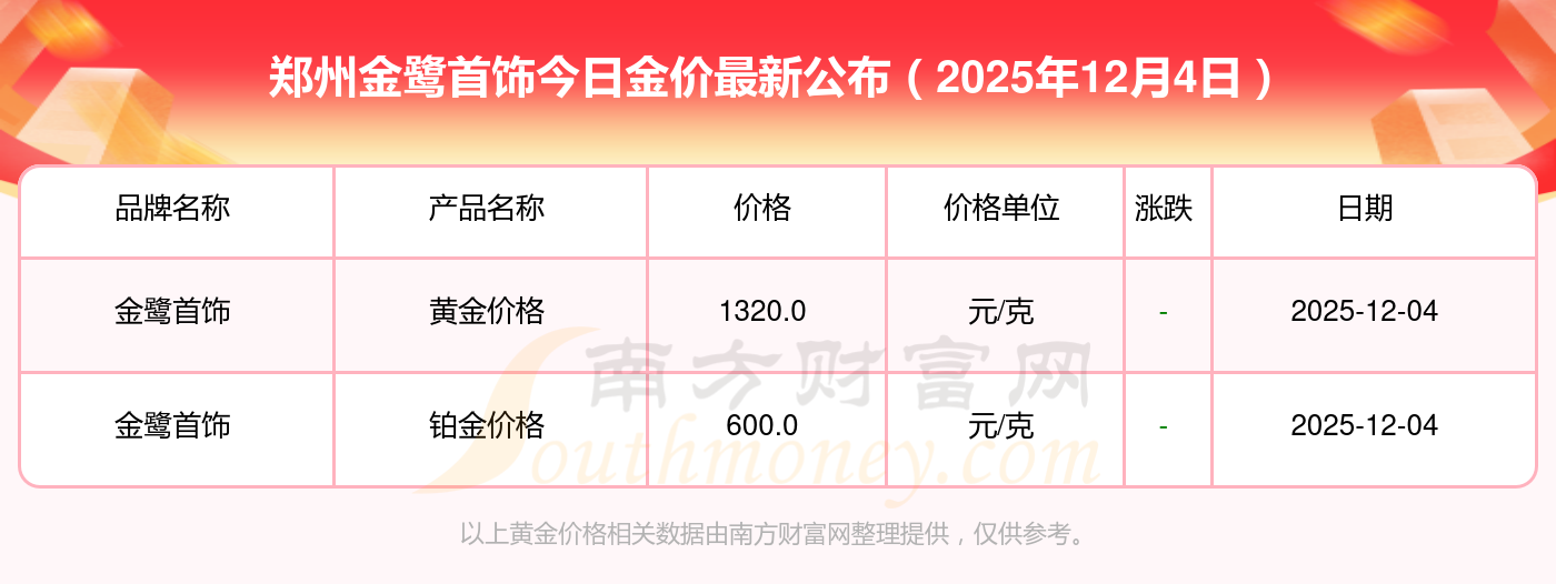2025年12月4日鄭州金鷺首飾黃金一克的市場(chǎng)行情價(jià)是多少?黃金價(jià)格1328.0元/克,鉑金價(jià)格671.0元/克,飾品金價(jià)(內(nèi)地)1328.0元/克,黃金飾品(香港)46730.0,鉑金價(jià)格(香港)19260.0,金條價(jià)格(香港)42160.0,金條金價(jià)(內(nèi)地)1165.0元/克,黃金價(jià)格1325.0元/克,鉑金價(jià)格600.0元/克,足金價(jià)格1325.0元/克,黃金價(jià)格1326.0元/克。