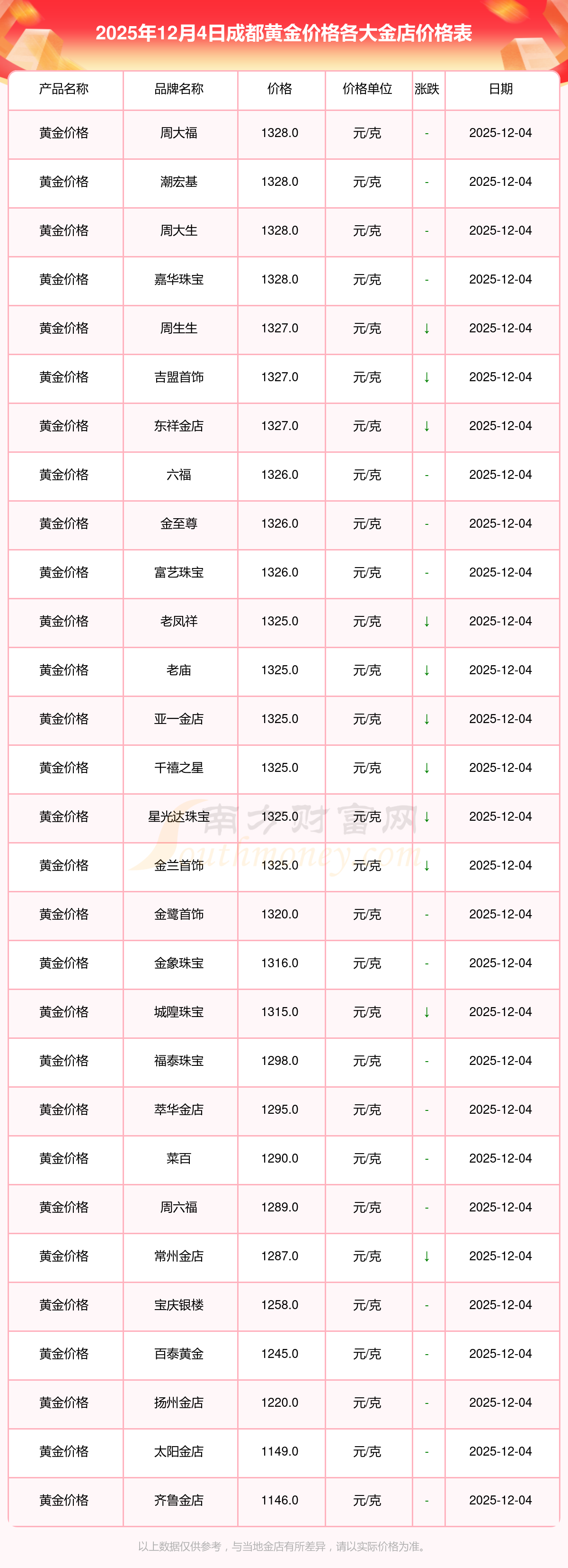 2025年12月4日成都各大金店黃金價(jià)格最新價(jià)格:周大福1328.0元/克,周大福671.0元/克,周大福1328.0元/克,周大福46730.0,周大福19260.0,周大福42160.0,周大福1165.0元/克,老鳳祥1325.0元/克,老鳳祥600.0元/克,老鳳祥1325.0元/克,六福1326.0元/克。