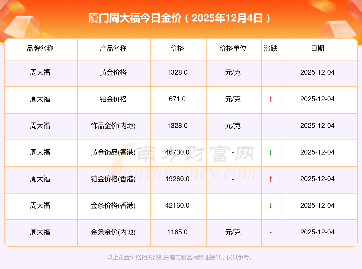 2025年12月4日廈門周大福最新價格:黃金價格1328.0元/克,鉑金價格671.0元/克,飾品金價(內(nèi)地)1328.0元/克,黃金飾品(香港)46730.0,鉑金價格(香港)19260.0,金條價格(香港)42160.0,金條金價(內(nèi)地)1165.0元/克,黃金價格1325.0元/克,鉑金價格600.0元/克,足金價格1325.0元/克,黃金價格1326.0元/克。