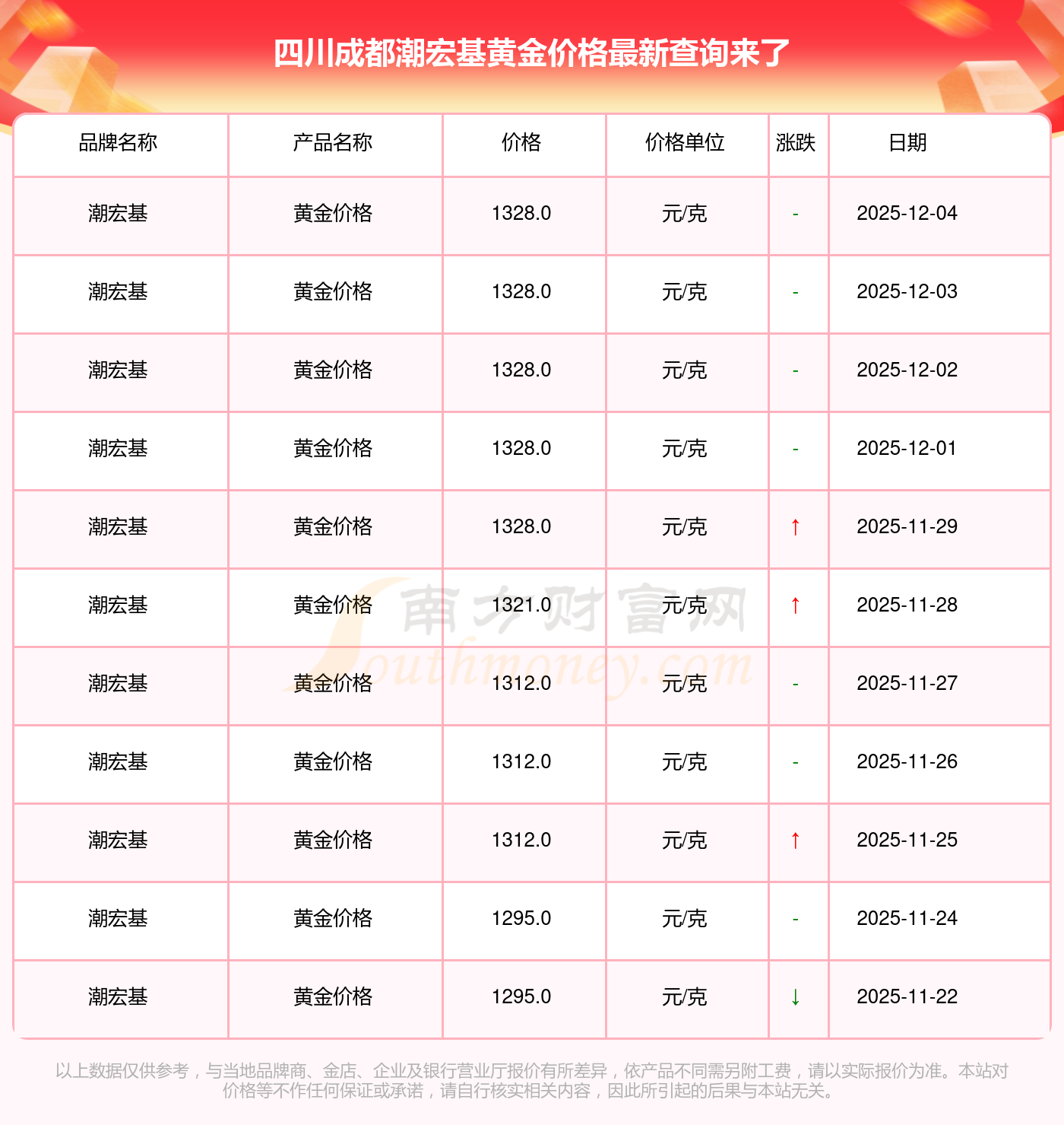 四川成都潮宏基黃金價(jià)格在 2025年12月4日,其市場價(jià)格為 1328.0元/克。