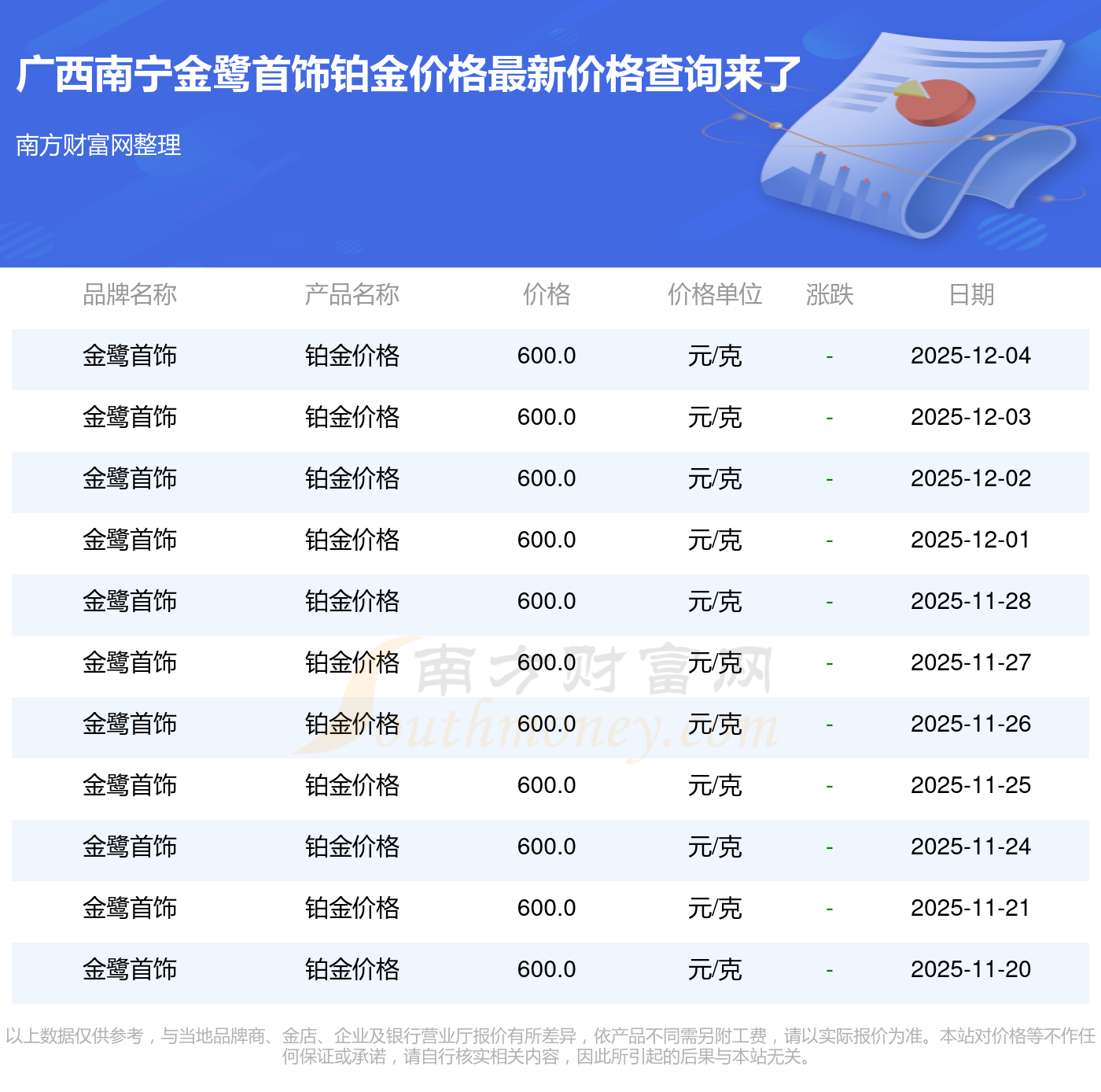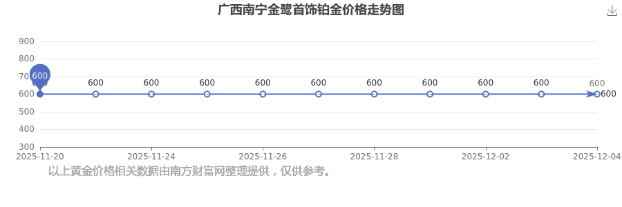 2025年12月4日廣西南寧金鷺首飾鉑金價(jià)格是600.0元/克。