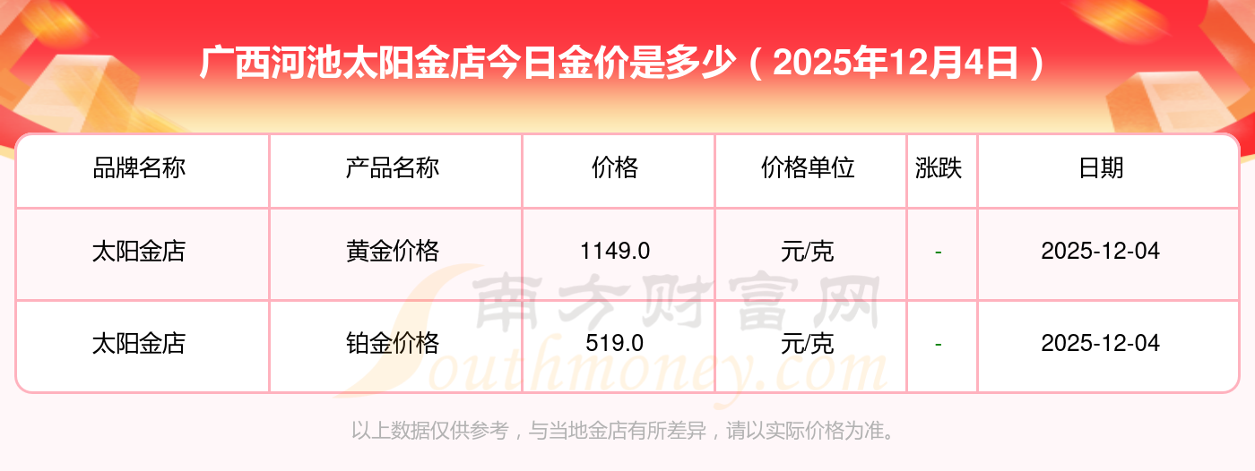2025年12月4日廣西河池太陽金店黃金今日價格最新查詢,今日太陽金店最新黃金價格是多少錢,隨小編來了解一下詳情。