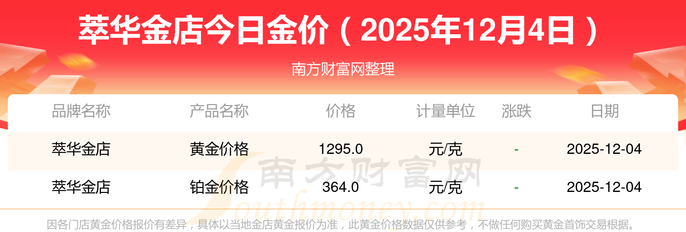 2025年12月4日周大福、周大福、周大福、周大福、周大福、周大福、周大福、老鳳祥、老鳳祥、老鳳祥、六福等各大金店品牌黃金價格最新價格如下:周大福黃金價格1328.0元/克,周大福鉑金價格671.0元/克,周大福飾品金價(內地)1328.0元/克,周大福黃金飾品(香港)46730.0,周大福鉑金價格(香港)19260.0,周大福金條價格(香港)42160.0,周大福金條金價(內地)1165.0元/克,老鳳祥黃金價格1325.0元/克,老鳳祥鉑金價格600.0元/克,老鳳祥足金價格1325.0元/克,六福黃金價格1326.0元/克。