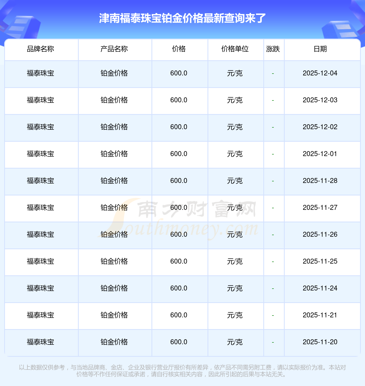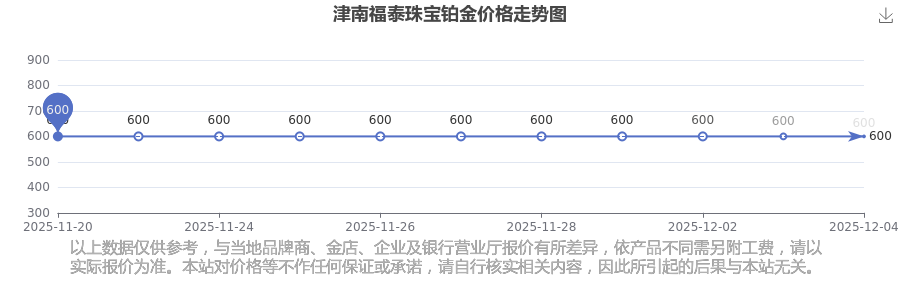 (2025年12月4日)今日津南福泰珠寶鉑金價(jià)格是600.0元/克。