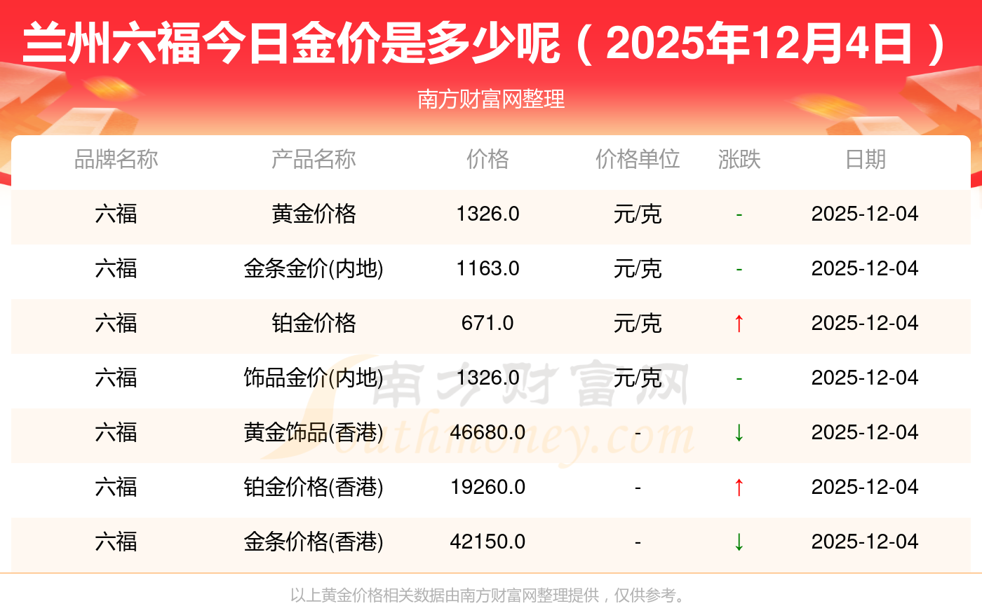 蘭州六福金價(jià)今日價(jià)格最新_蘭州六福黃金多少錢一克2025年12月4日,隨小編來了解一下詳情。