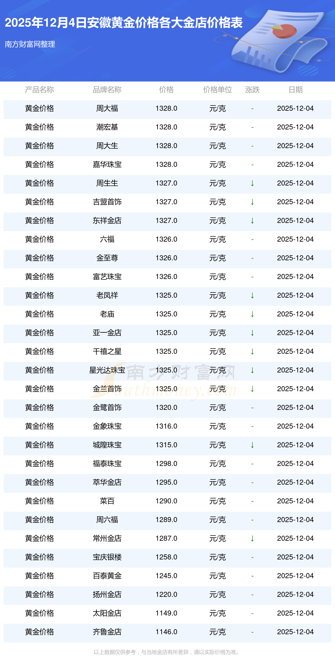 2025年12月4日安徽各大金店黃金價格最新價格:周大福1328.0元/克,周大福671.0元/克,周大福1328.0元/克,周大福46730.0,周大福19260.0,周大福42160.0,周大福1165.0元/克,老鳳祥1325.0元/克,老鳳祥600.0元/克,老鳳祥1325.0元/克,六福1326.0元/克。
