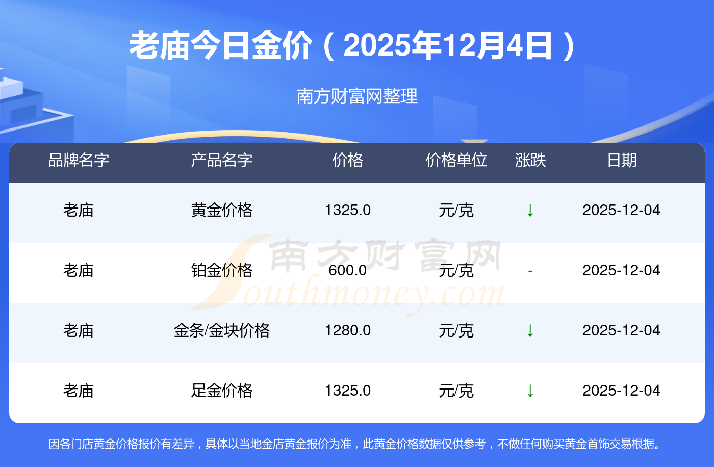 2025年12月4日老廟今日價(jià)格:黃金價(jià)格1328.0元/克,鉑金價(jià)格671.0元/克,飾品金價(jià)(內(nèi)地)1328.0元/克,黃金飾品(香港)46730.0,鉑金價(jià)格(香港)19260.0,金條價(jià)格(香港)42160.0,金條金價(jià)(內(nèi)地)1165.0元/克,黃金價(jià)格1325.0元/克,鉑金價(jià)格600.0元/克,足金價(jià)格1325.0元/克,黃金價(jià)格1326.0元/克。