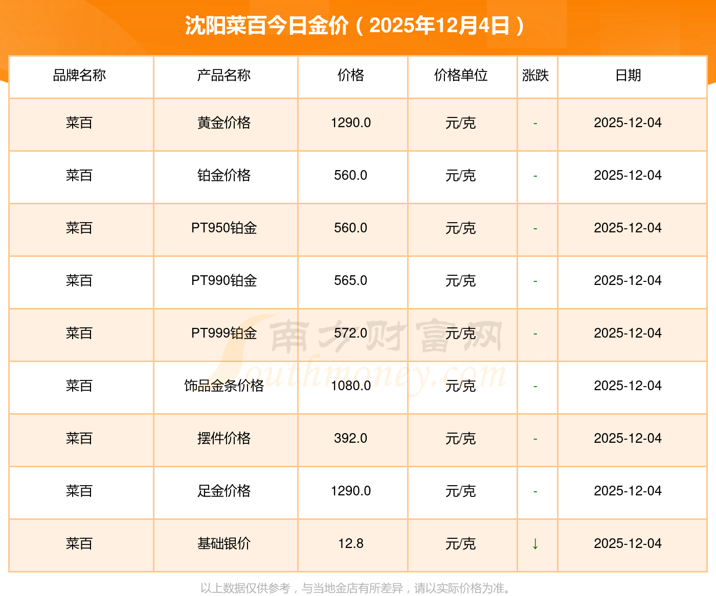 2025年12月4日沈陽(yáng)菜百今日價(jià)格:黃金價(jià)格1328.0元/克,鉑金價(jià)格671.0元/克,飾品金價(jià)(內(nèi)地)1328.0元/克,黃金飾品(香港)46730.0,鉑金價(jià)格(香港)19260.0,金條價(jià)格(香港)42160.0,金條金價(jià)(內(nèi)地)1165.0元/克,黃金價(jià)格1325.0元/克,鉑金價(jià)格600.0元/克,足金價(jià)格1325.0元/克,黃金價(jià)格1326.0元/克。