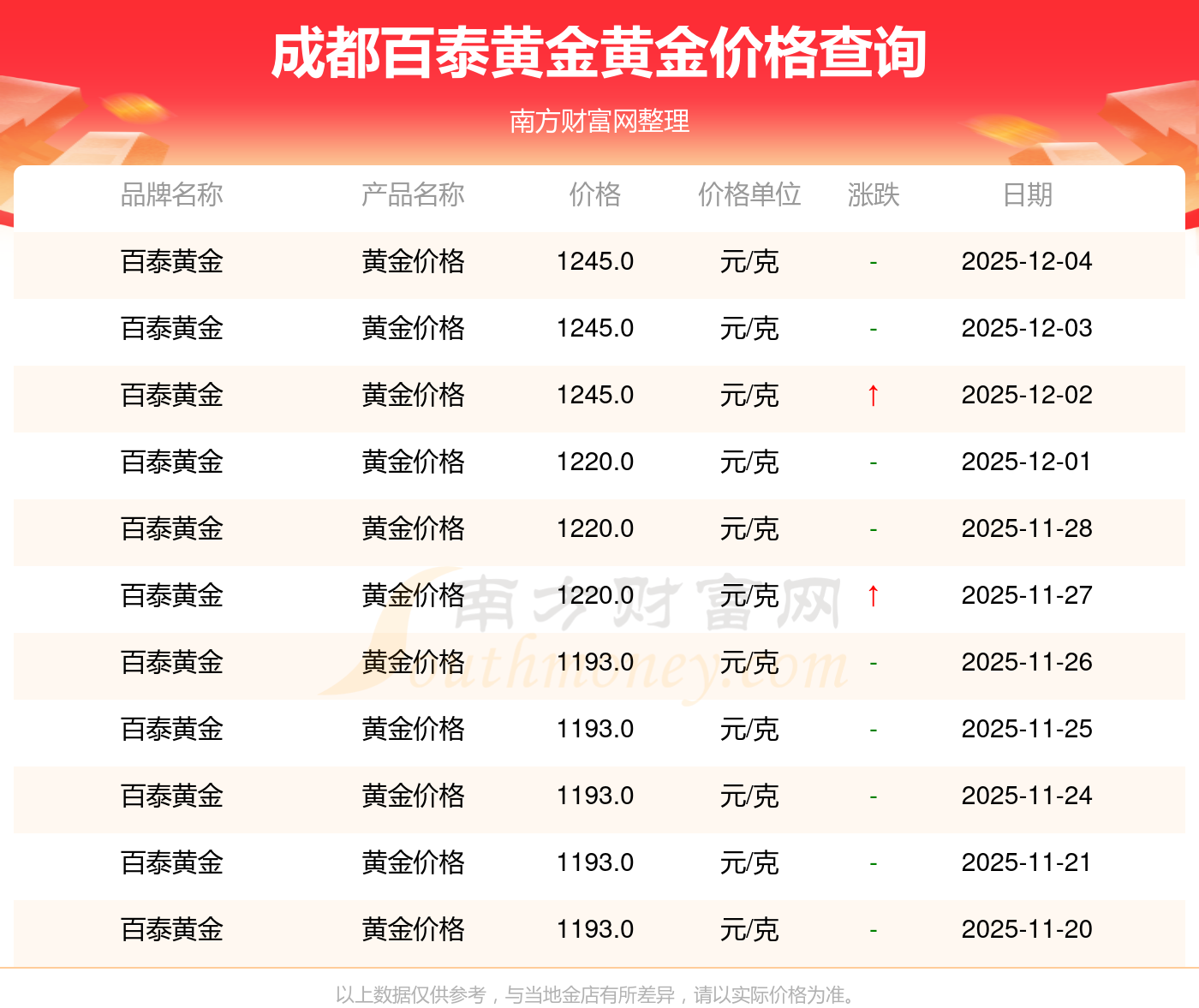 成都百泰黃金 2025年12月4日的黃金價格價位為 1245.0元/克。