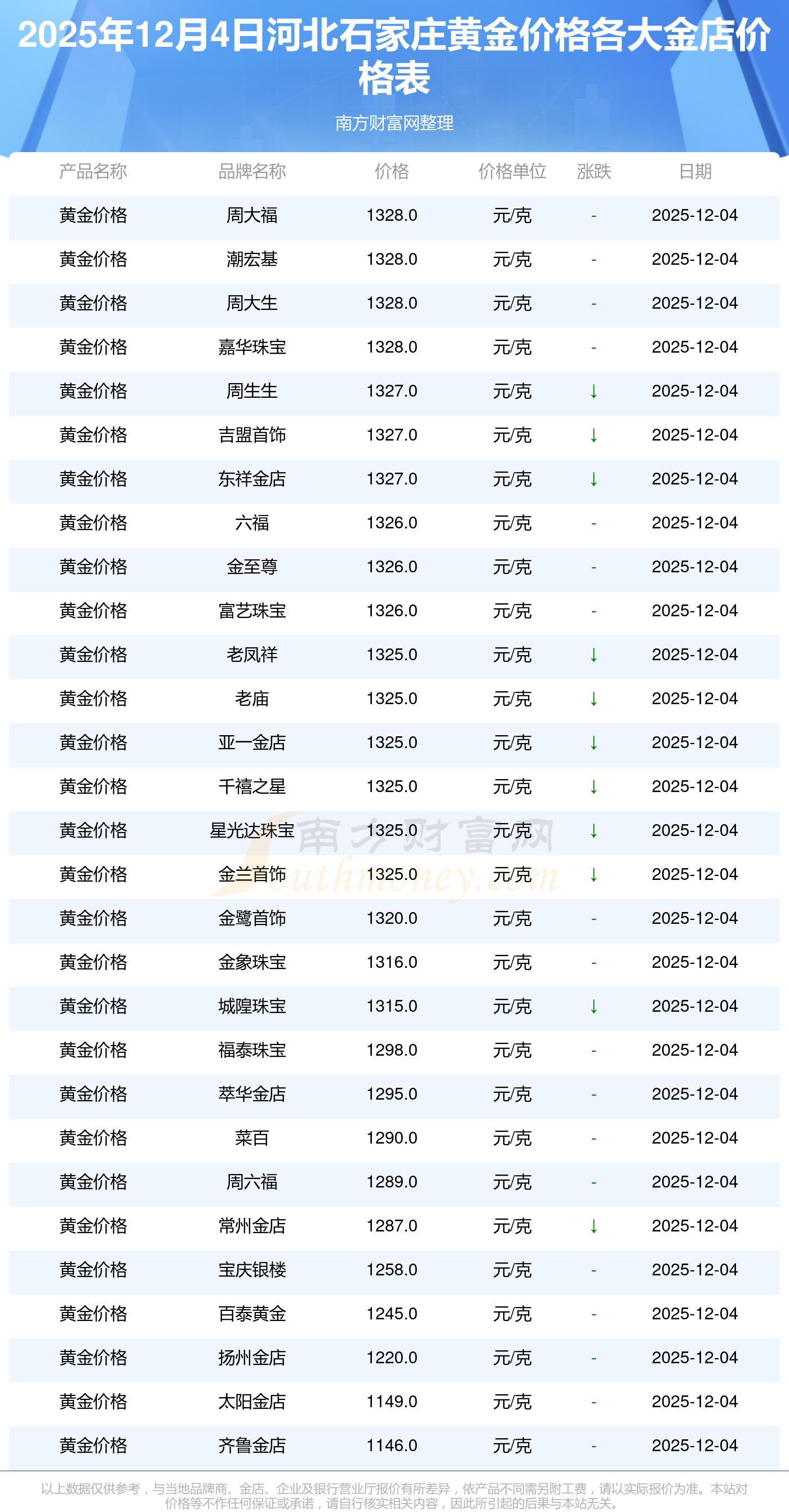 2025年12月4日,河北石家莊周大福、周大福、周大福、周大福、周大福、周大福、周大福、老鳳祥、老鳳祥、老鳳祥、六福等各大金店品牌黃金價格今日價格行情最新來了:周大福1328.0元/克、周大福671.0元/克、周大福1328.0元/克、周大福46730.0、周大福19260.0、周大福42160.0、周大福1165.0元/克、老鳳祥1325.0元/克、老鳳祥600.0元/克、老鳳祥1325.0元/克、六福1326.0元/克。